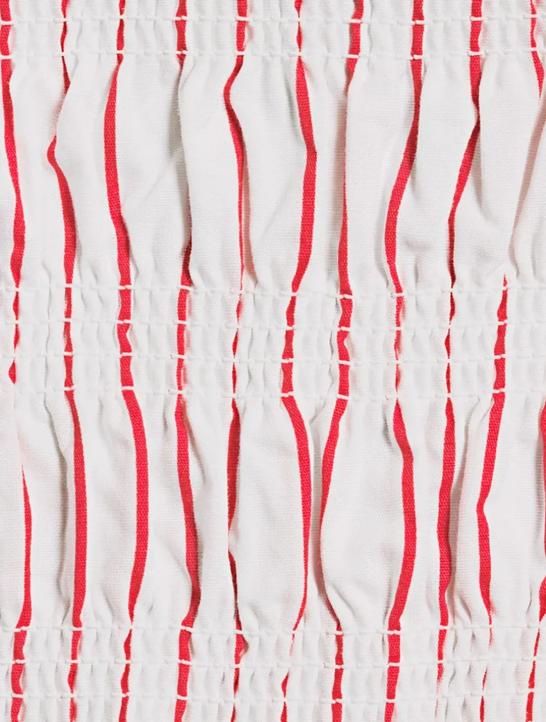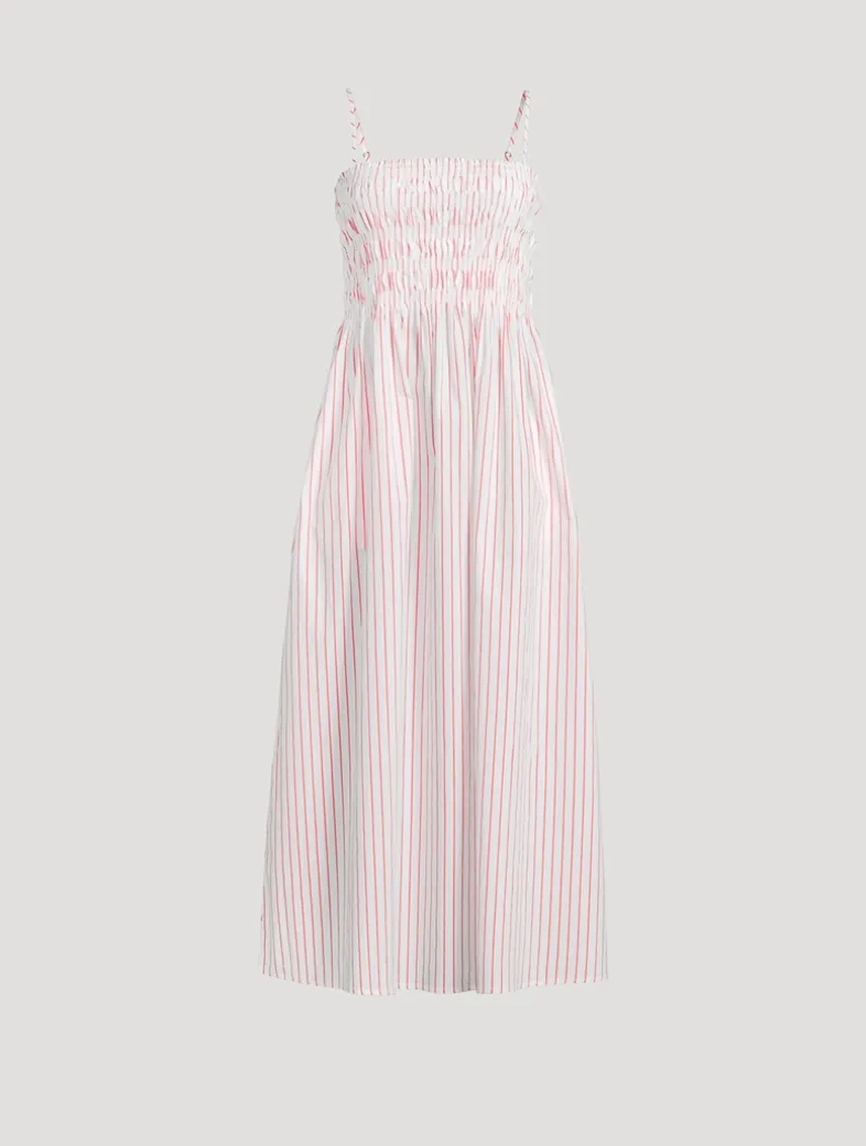 This breezy day dress is crafted from a flowing, lightweight cotton blend printed with stripes. Featuring a smocked bodice with ruched design details, topped with adjustable shoulder straps.