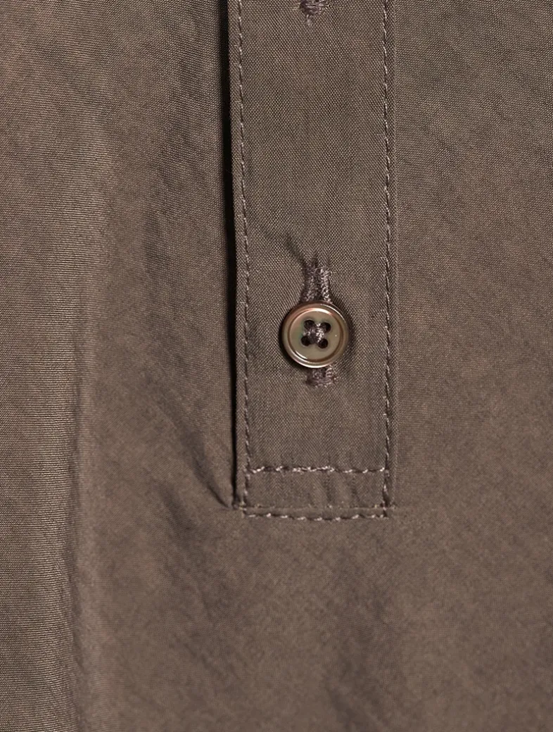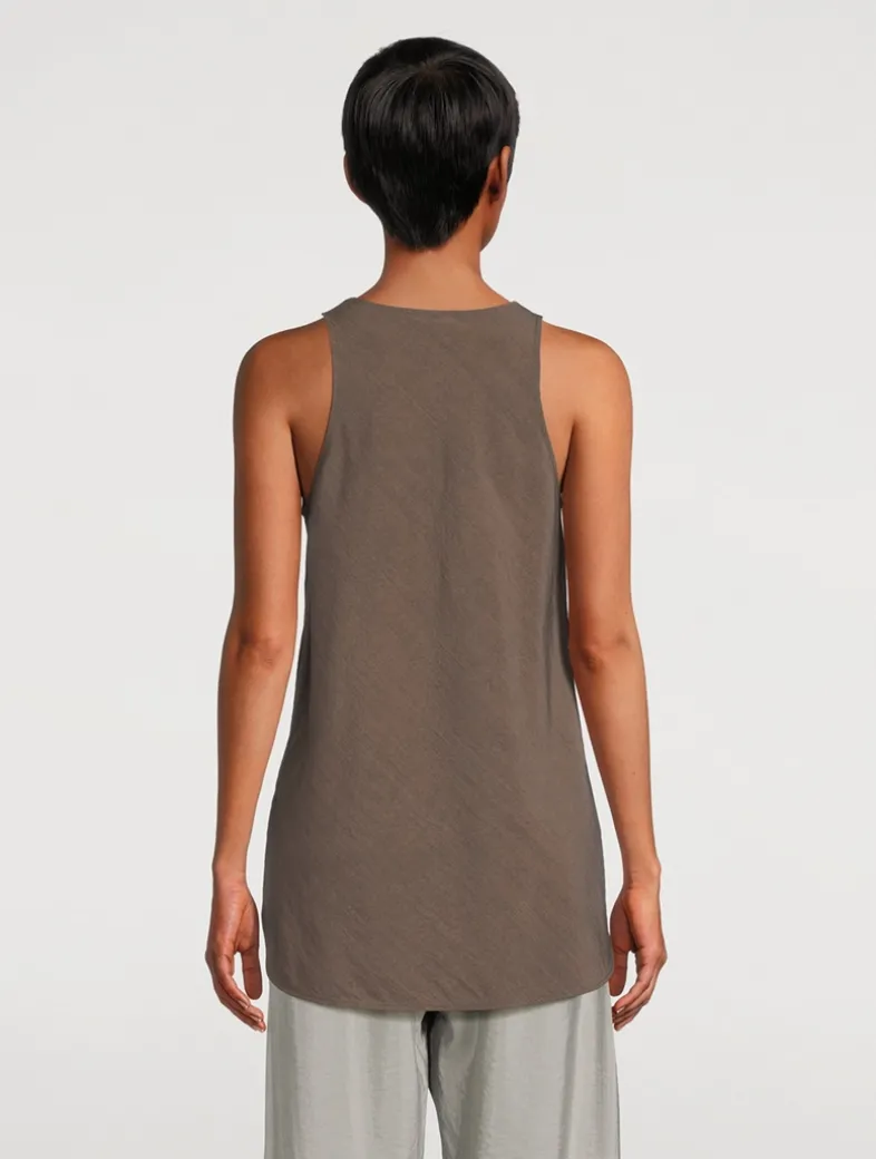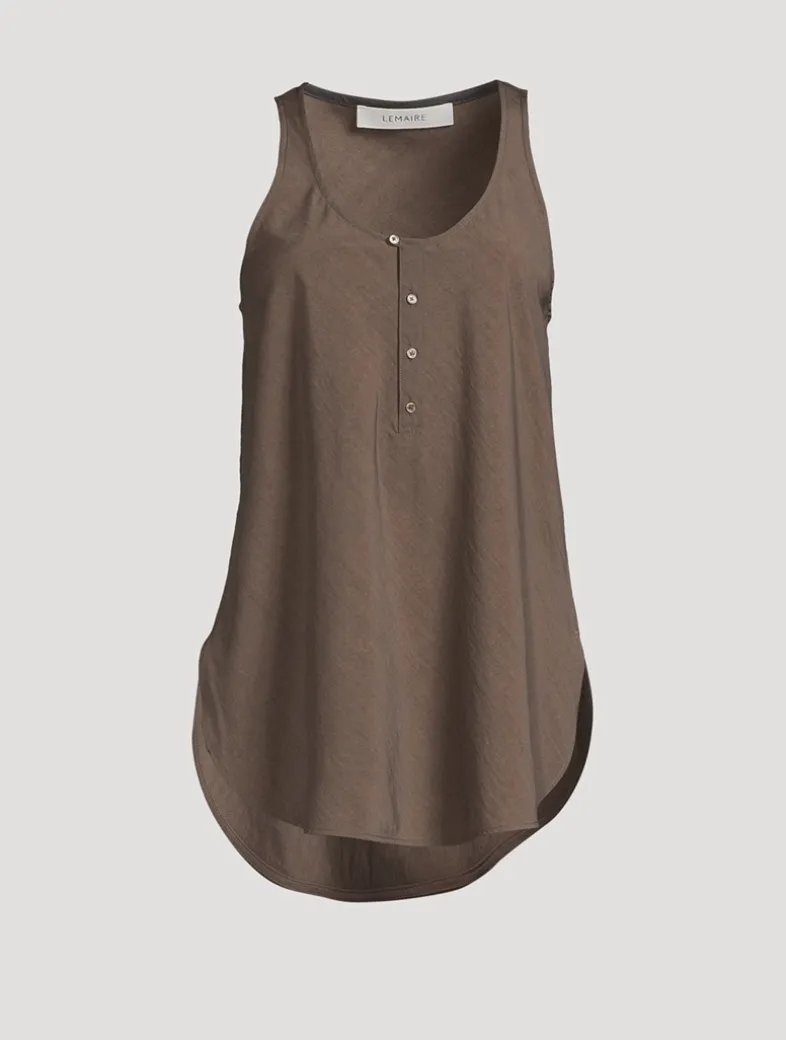 This tank is crafted from technical Lyocell, a lightweight yet structured material with a soft hand and a fresh feel on the skin. It features a straight cut and its round neckline is fastened via a small placket that includes four buttons, with a thread loop securing the top button. Tonal stitching runs along the seams, while a discreet contrasting satin lining reinforces the seams around the collar and arm holes.
