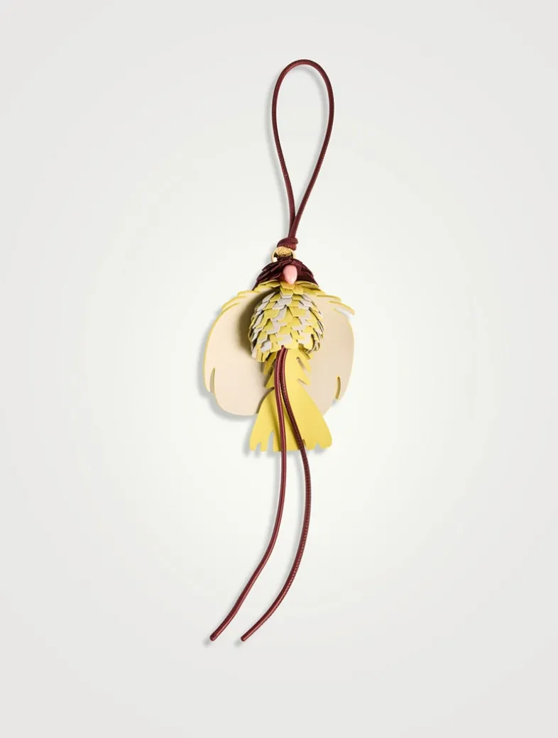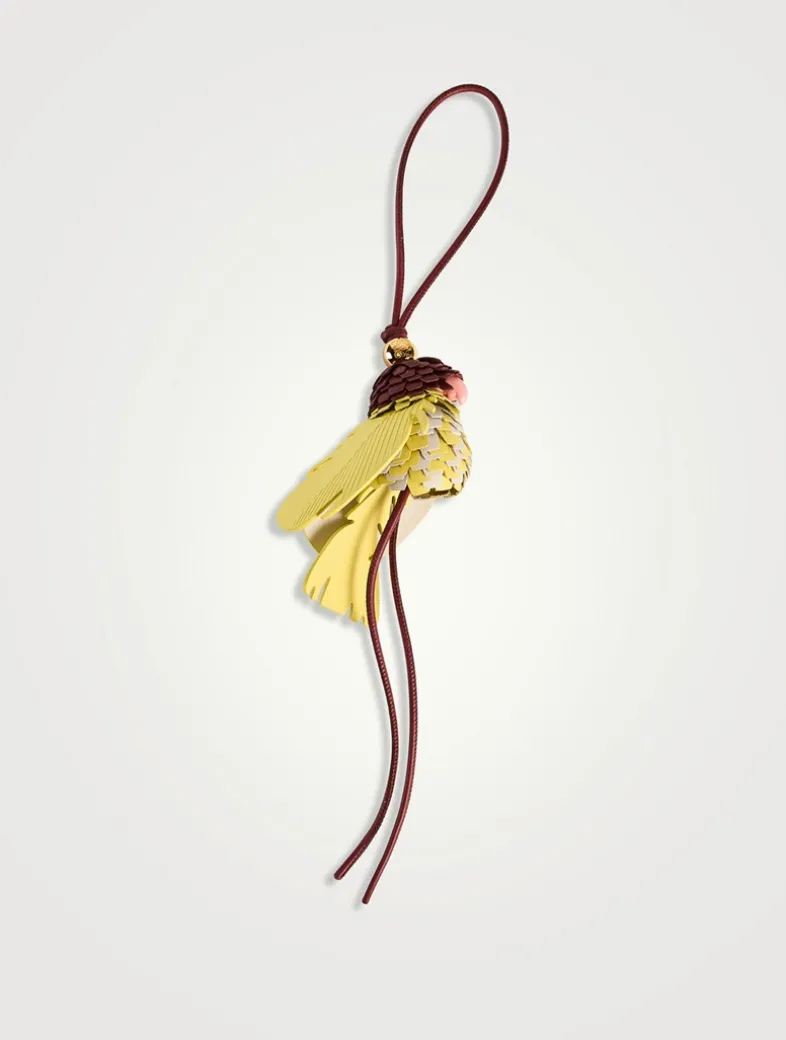 This bird charm, in classic calfskin, is designed with a looped calfskin strap and an Anagram Pebble in a gold-tone finish.
