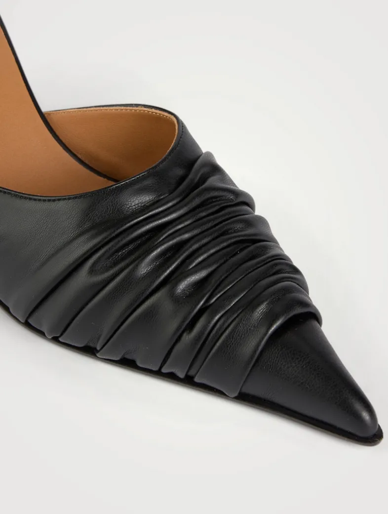 The Birdee ruched mule has a sleek silhouette with a pointed toe. Crafted from stretch faux leather and finished with an embossed inverted skull heel detail.