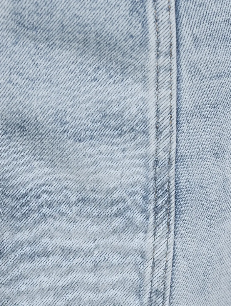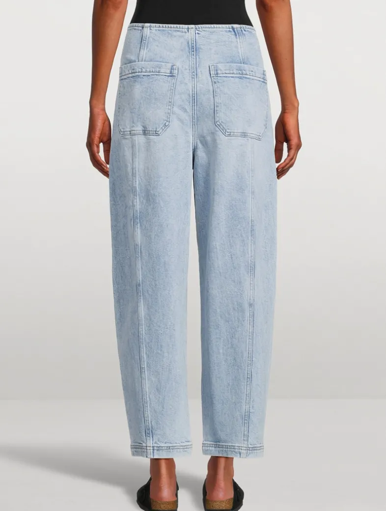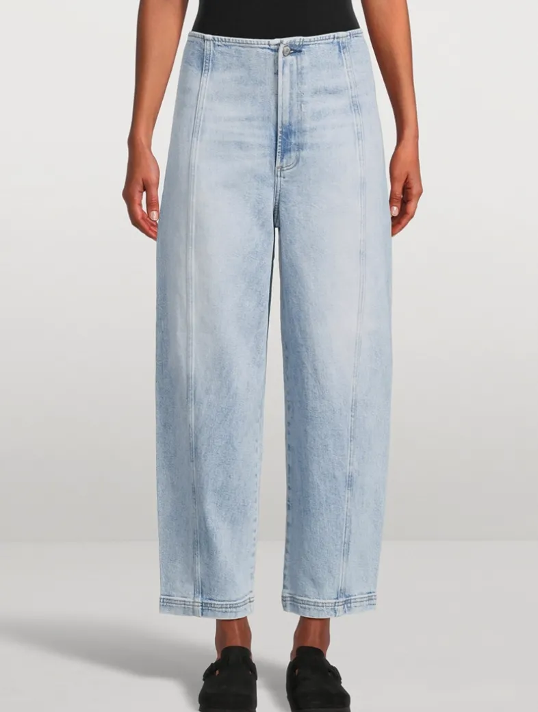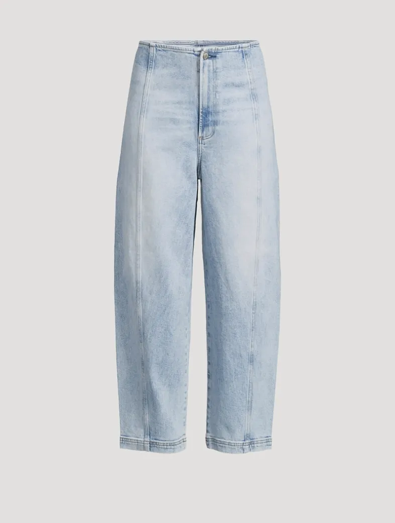 The unique shape of these barrel-leg jeans offers a modern twist, while the absence of a waistband creates a smooth, streamlined silhouette that feels inherently sophisticated. Notice the chic seaming details and ankle-length inseam.
