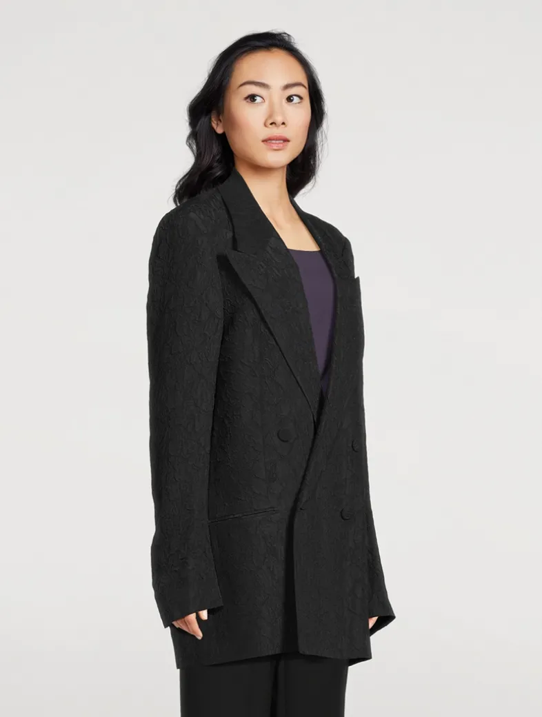 Cut to an oversized silhouette, this double-breasted blazer mixes a borrowed-from-the-boys charm with elegant styling. The silk-blend jacket has a textured cloqué finish, covered buttons, and welt pockets at the waist.