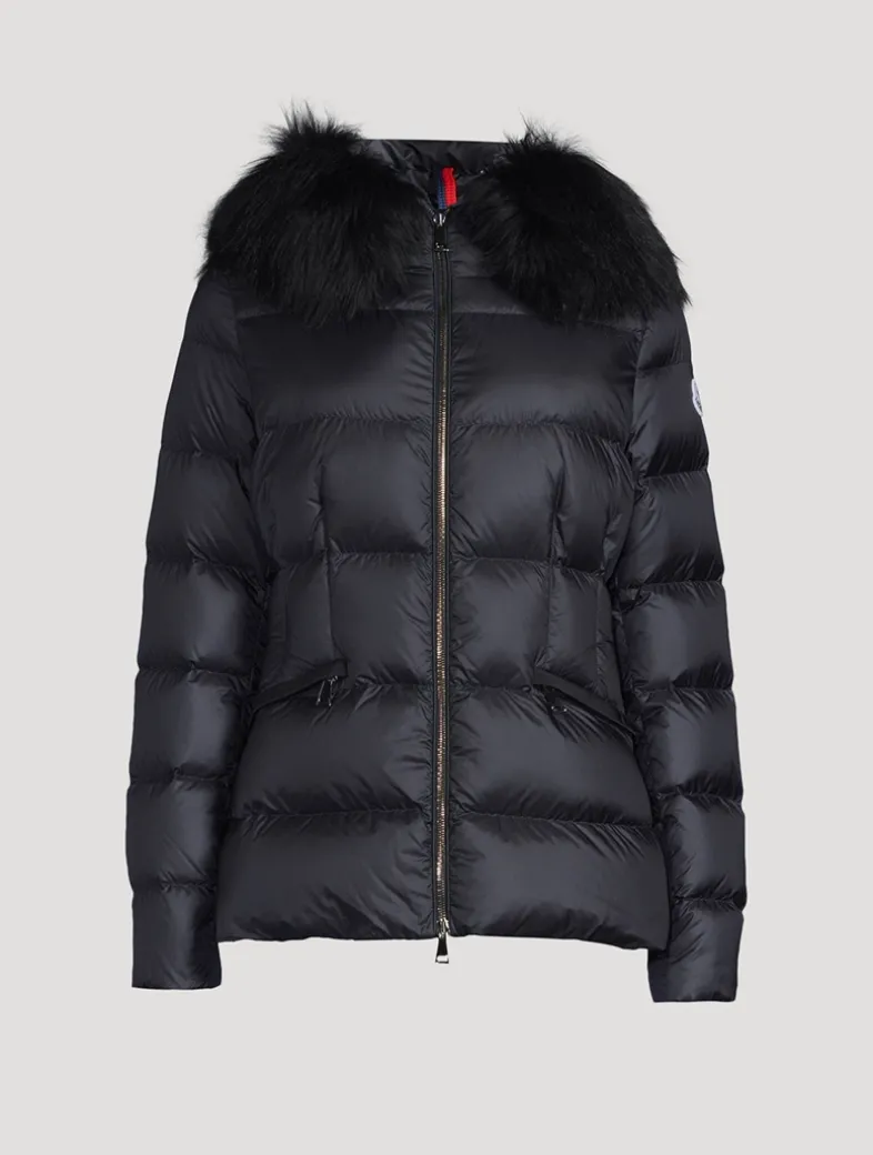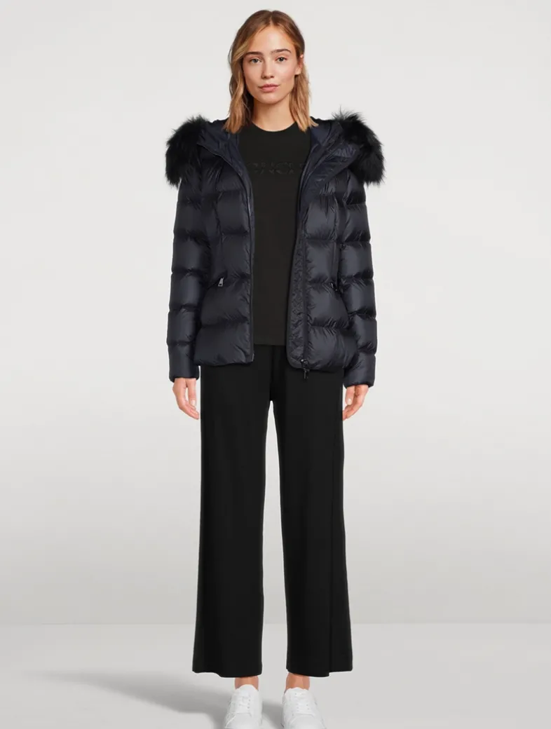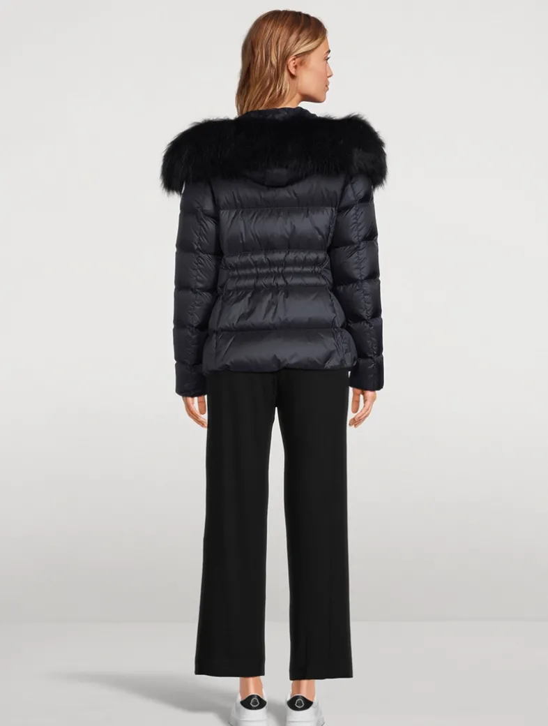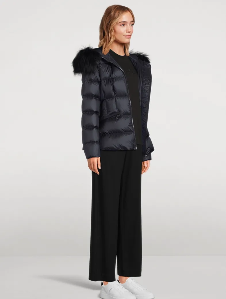 The Boed down jacket delivers a sophisticated winter look, showcasing a feminine silhouette accentuated by a nipped-in waistline. Crafted from longue saison, the hooded puffer jacket is finished with a luxurious shearling trim.
