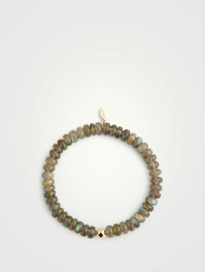 Labradorite Rondelle beads are strung together with a yellow gold rock bead, and finished with a gold Anzie tag.