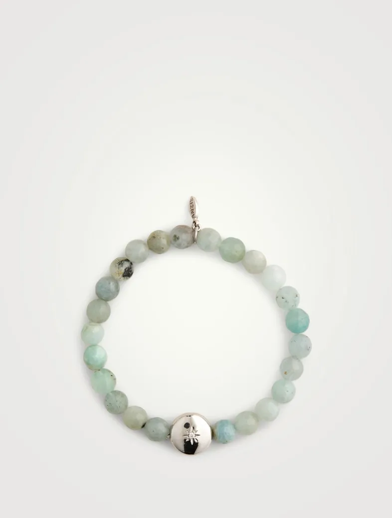 Faceted aquamarine beads are strung together with a sterling silver and white topaz vintage star charm on a stretchy cord.