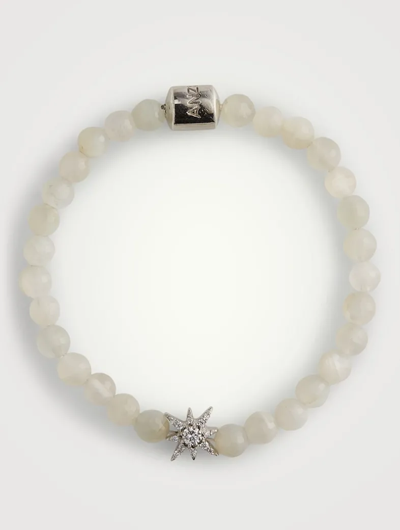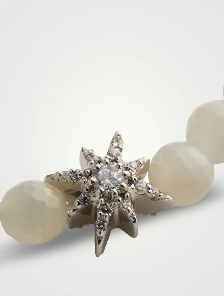 Faceted moonstone beads are strung together with a sterling silver and white topaz starburst charm on a stretchy cord.