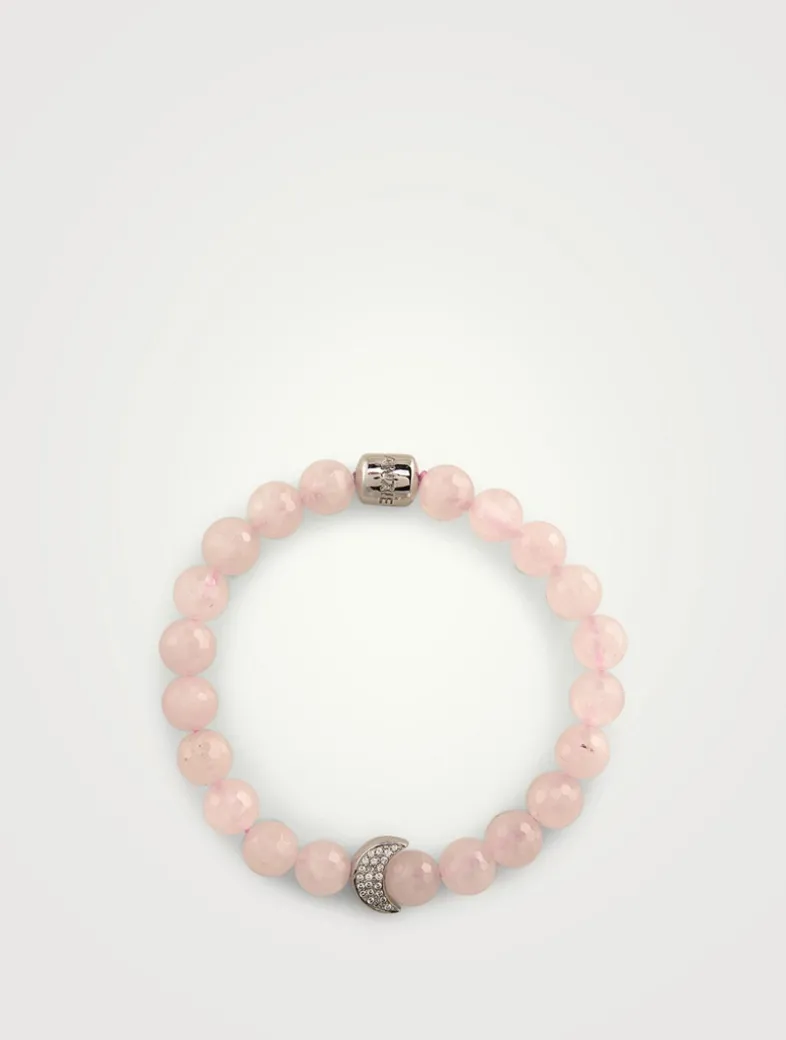 This bohemian bracelet features rose quartz beads strung together with a sterling silver moon set with pavé clear Topaz on a stretchy cord.