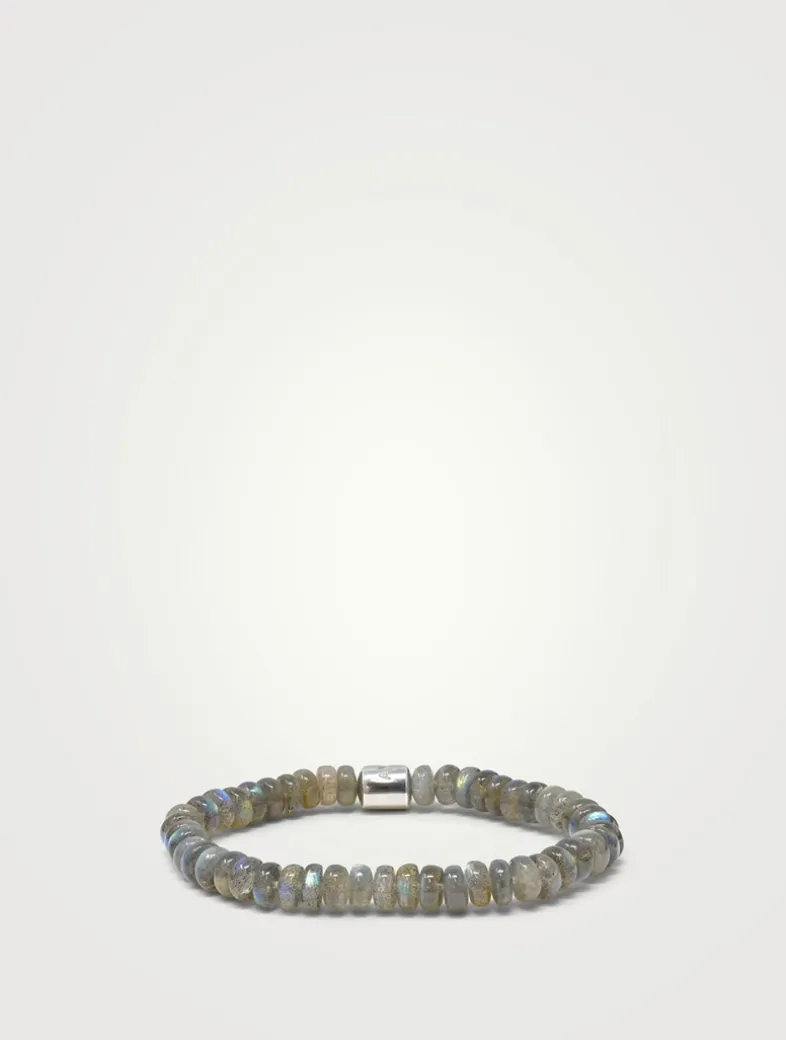 Labradorite rondelles are paired with a polished Anzie logo bead. This bracelet is strung on a stretch cord, making it easy and comfortable to wear.