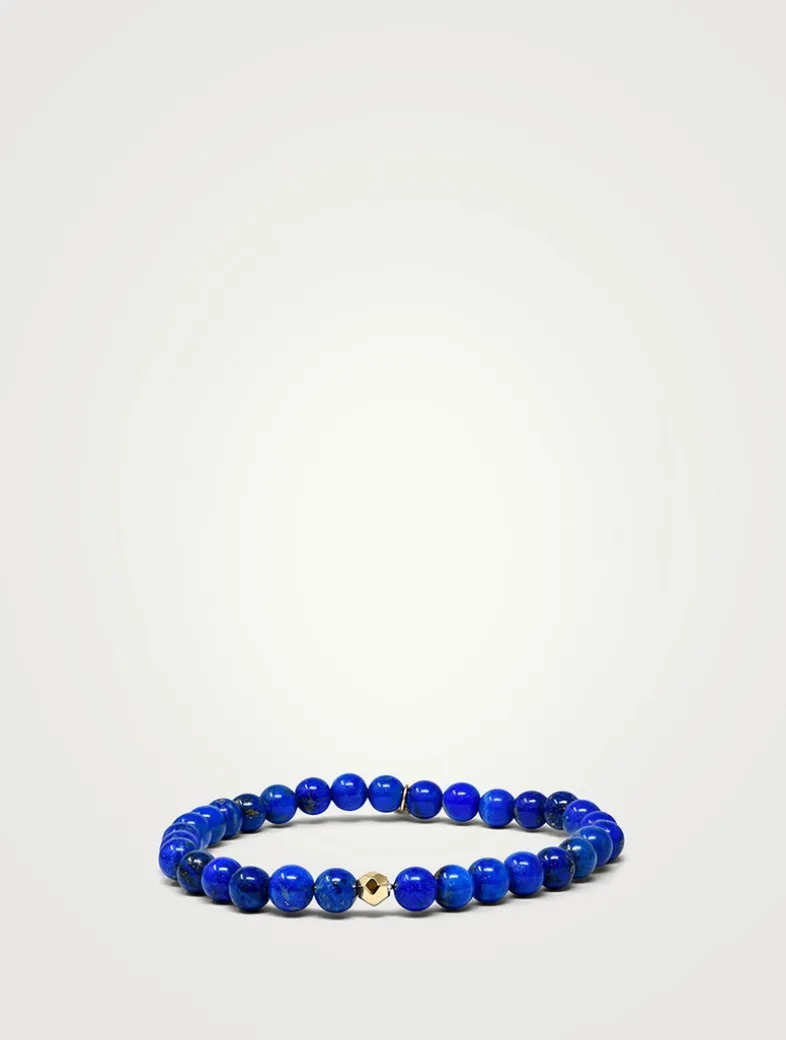 Smooth lapis beads are strung together with a yellow gold rock bead, and finished with a gold Anzie tag.
