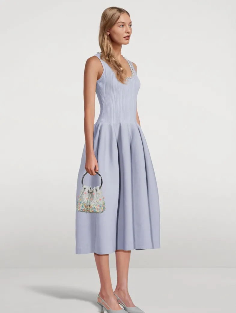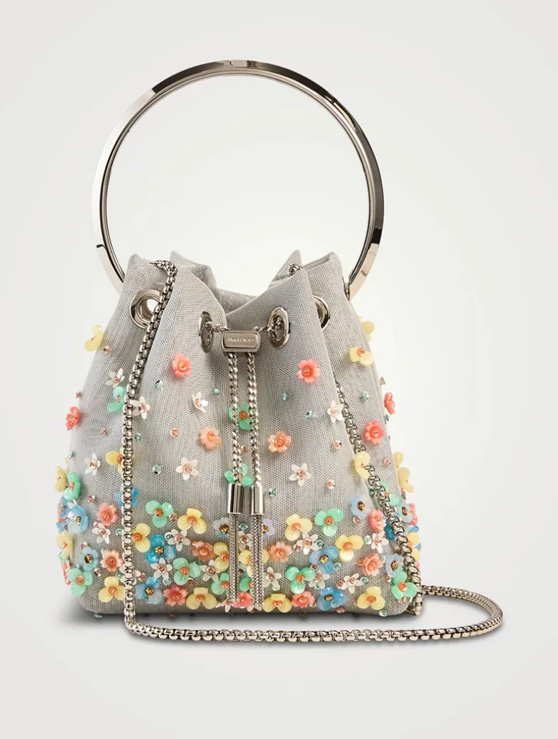 The Bon Bon, adorned with light-catching crystals and floral embellishments, is an irresistible, statement bag. Defined by a bucket silhouette crowned with a fixed bracelet handle, this versatile piece is complemented by a chain shoulder strap, meaning it can also be worn as a crossbody style.