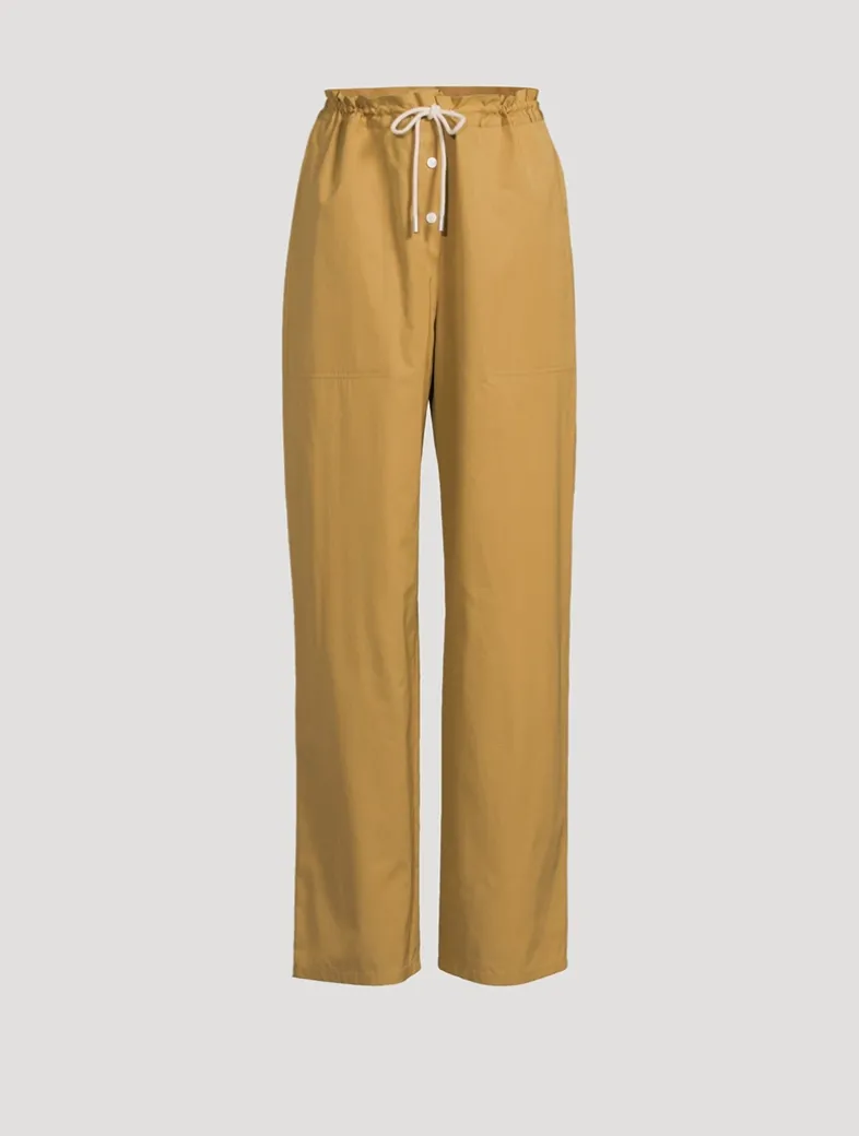 High-waisted, pull-on pant in crisp technical cotton. They are cut with a relaxed fit and feature snap buttons with a drawstring waistband, and side seam pockets.