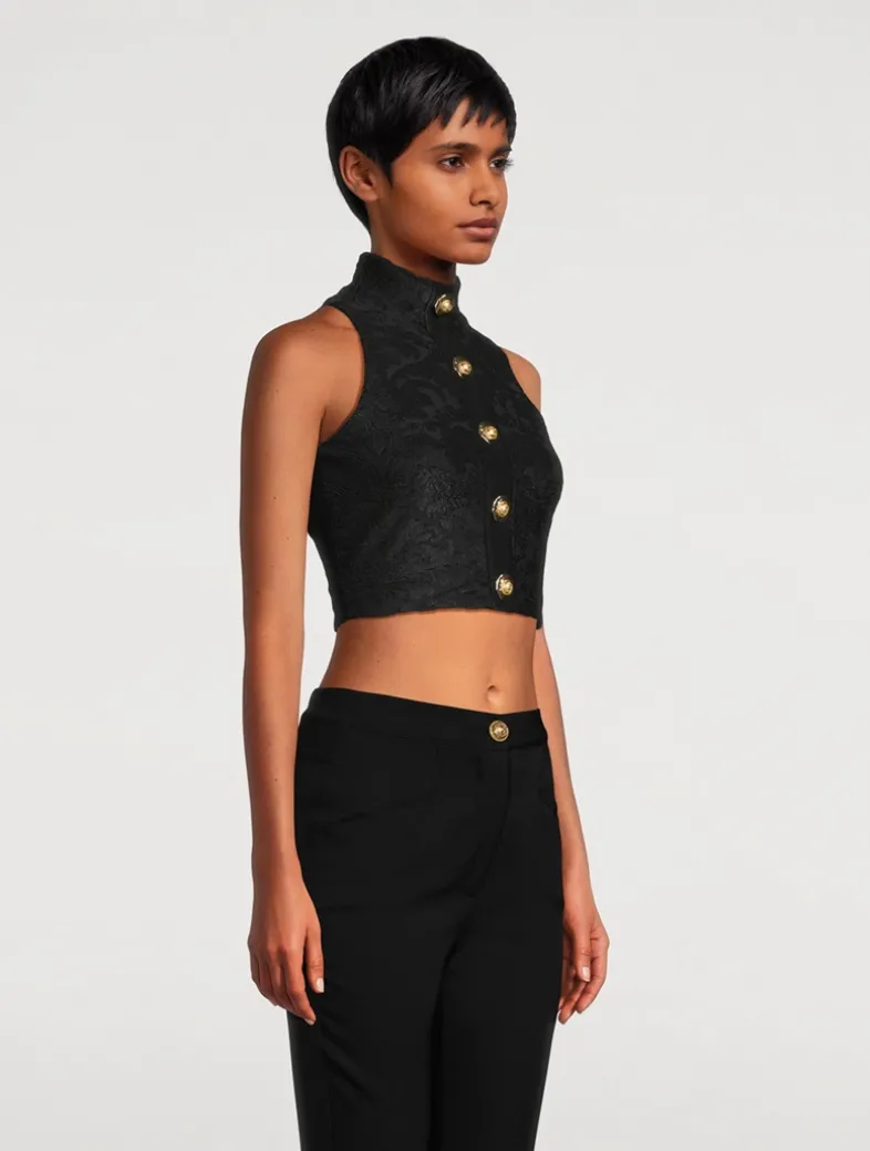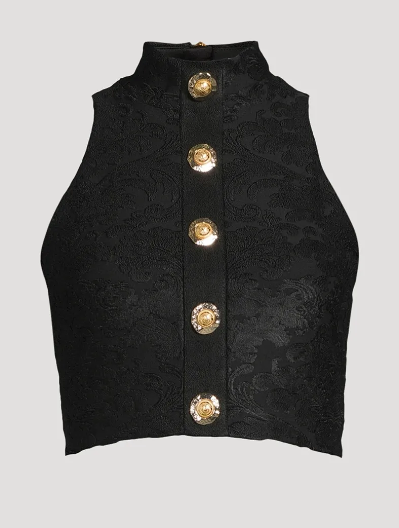 Embellished with metal ‘Gold and Gold Coin’ decorative buttons on the front, this halter-style crop top is finished with subtle jacquard detailing.