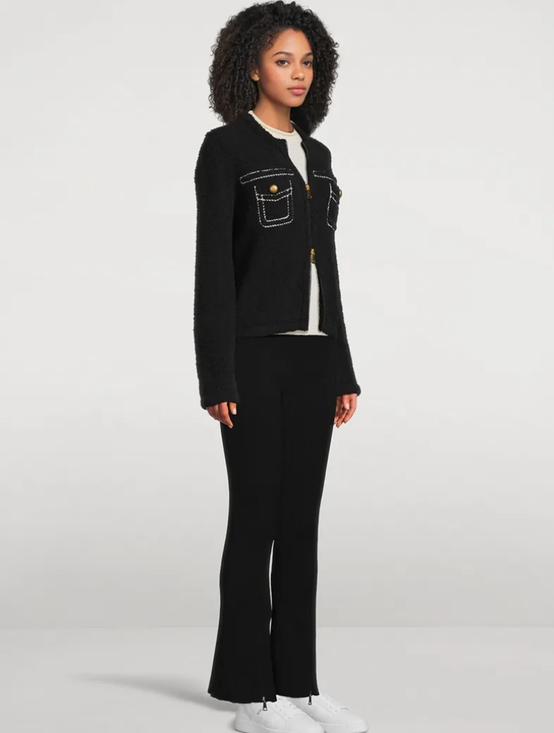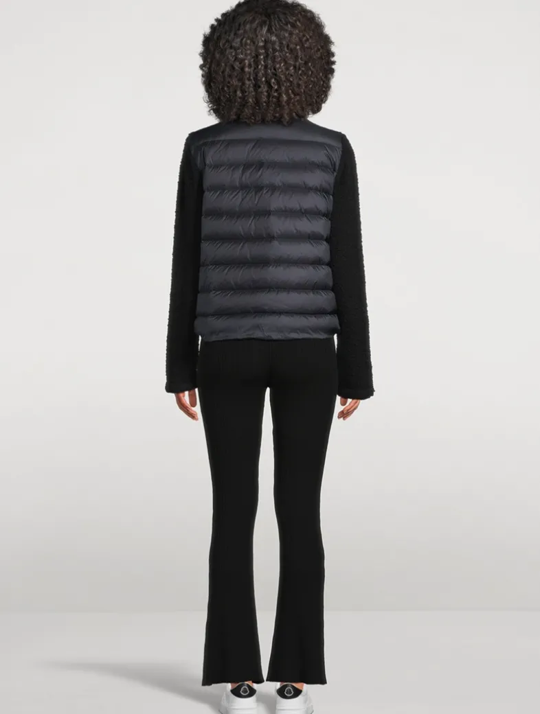 A soft bouclé finish lends a textured touch to this zip-front cardi. It is filled with down for added warmth and embellished with contrast stitching highlighting the pockets.