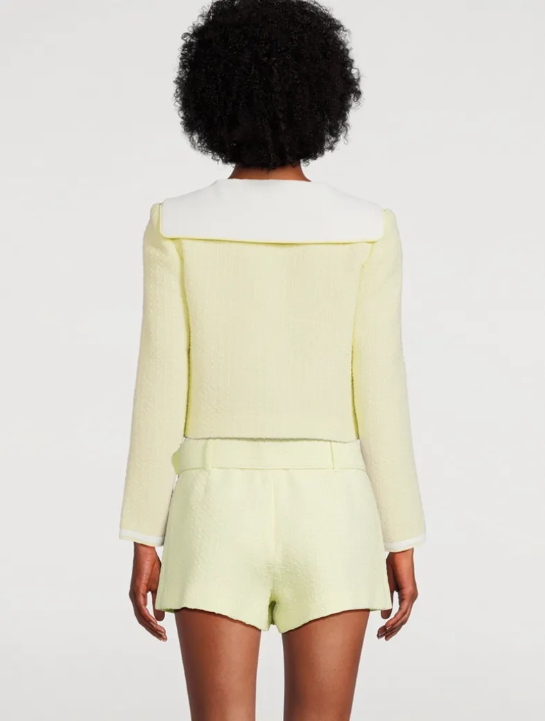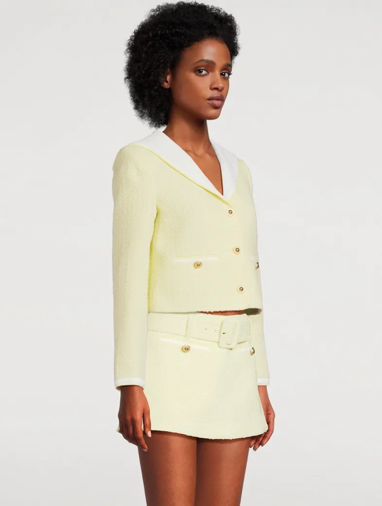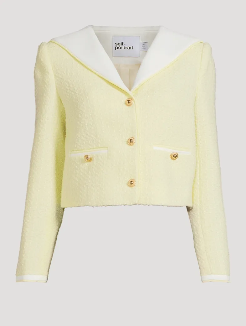 Classic tailoring gets a fresh update with this bouclé blazer. Gold-tone buttons and a contrast collar enhance its retro, preppy charm.