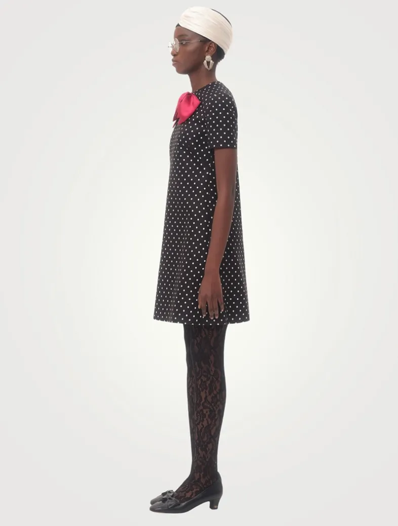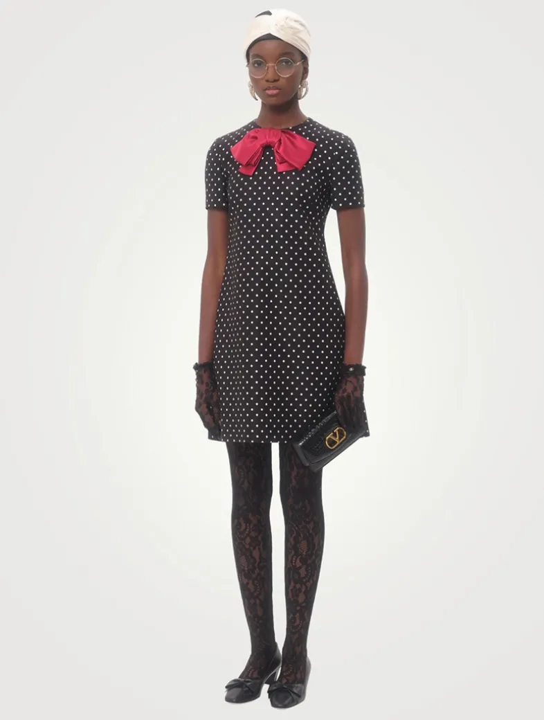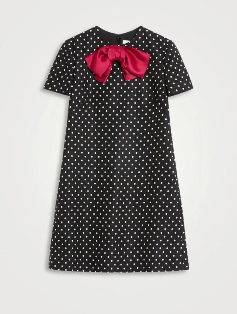 The minimalist look of this shift dress is offset with a statement satin bow at the collar. A polka dot print further enhances its whimsical charm.