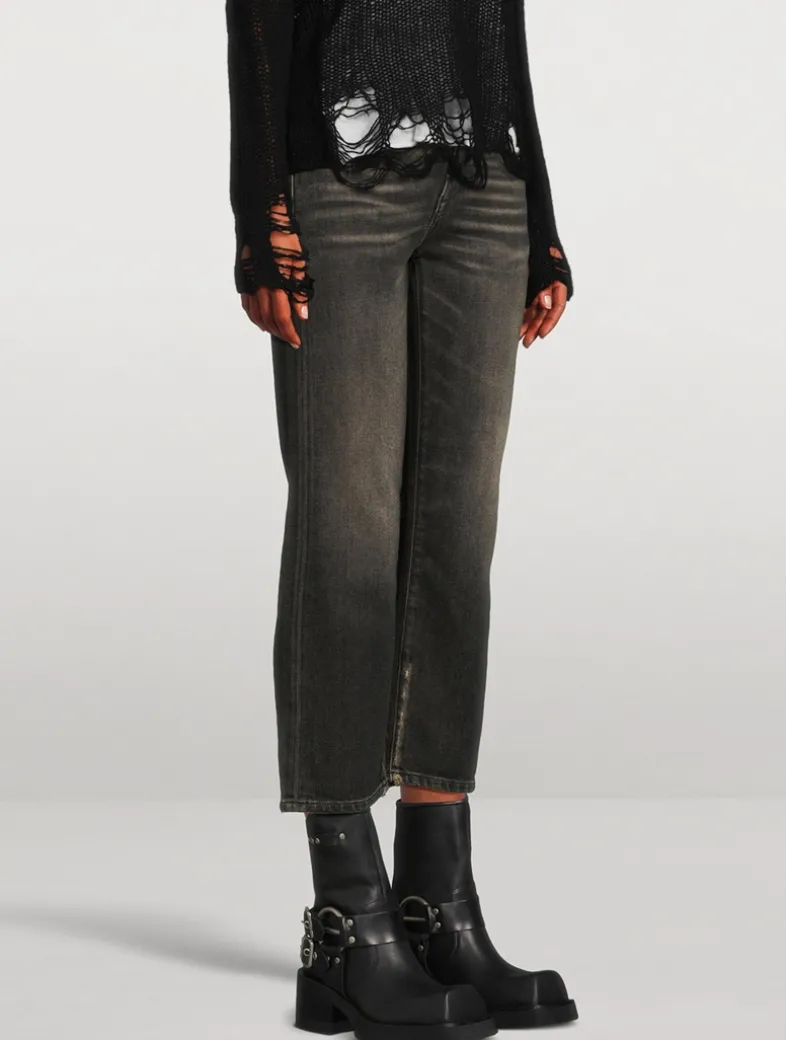 Made in Italy, these five-pocket jeans are crafted from comfort stretch Italian denim. The design features a straight leg and cropped silhouette with heavy fading and destroyed hems.