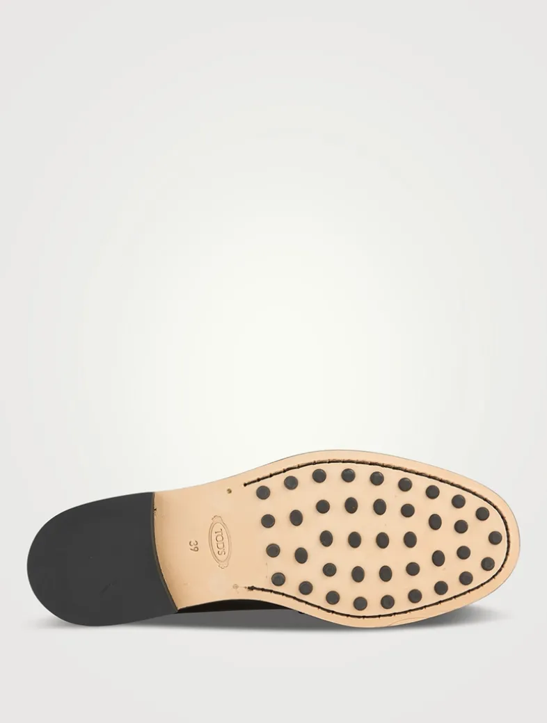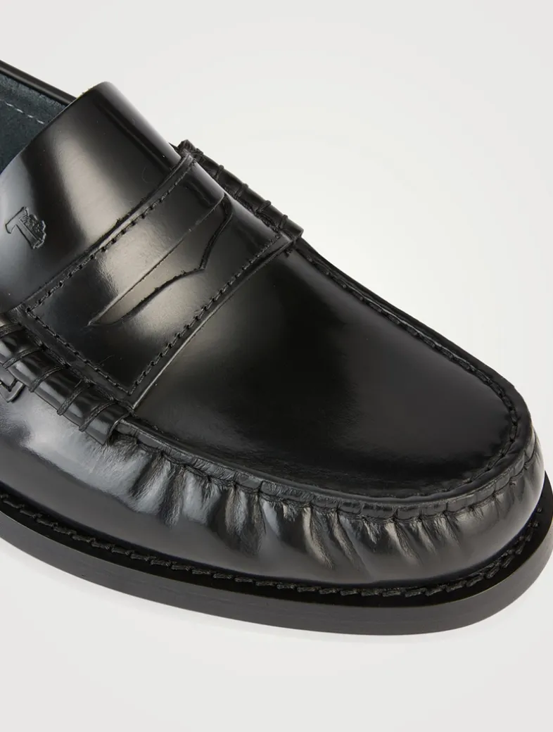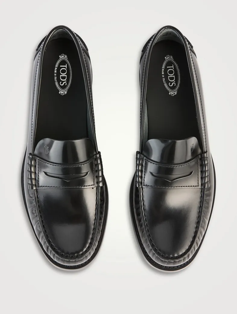 Loafers in brushed calfskin leather with penny bar and stamped Tod’s monogram. Characterized by a slightly gathered toe, they come with a leather outsole with rubber injection.