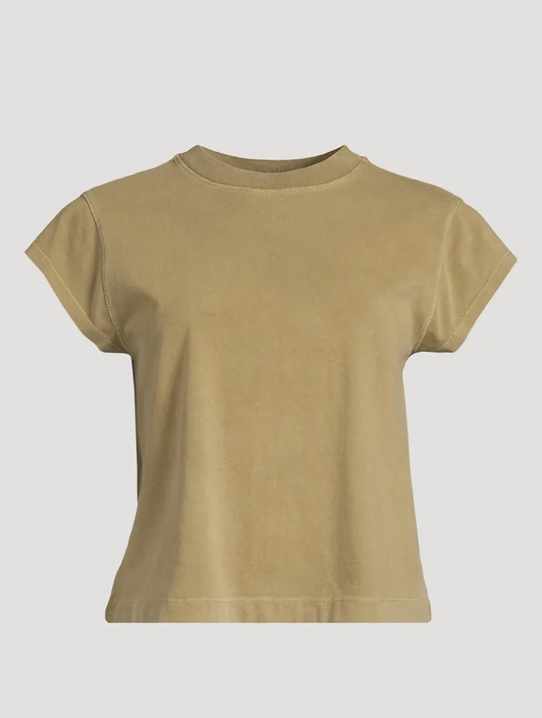 Framed by cap sleeves and topped with a crew neckline, this relaxed-fit tee is made from 100% cotton jersey.