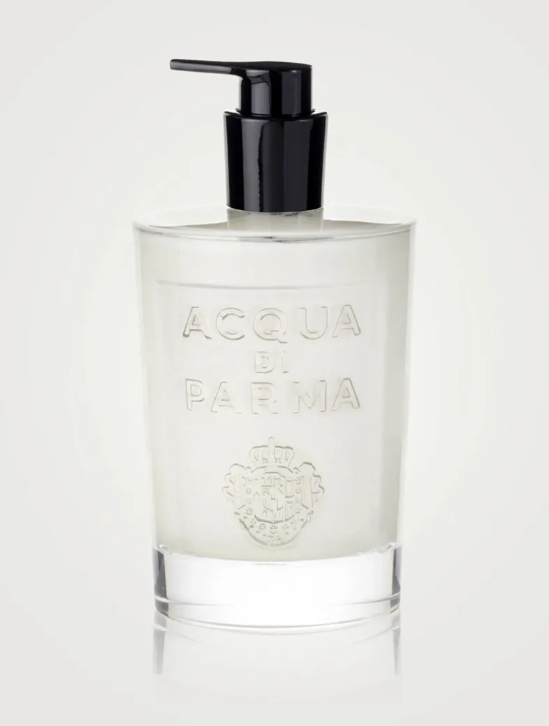 Easy to apply with a quick-absorbing texture, the Buongiorno Hand Lotion ensures that your skin feels moisturized without leaving any oily residue. Upon application, the lotion imparts distinct notes of Buongiorno, subtly scenting the skin and providing a refined sensory experience. Ideal for daily use, this lotion elevates your personal care ritual. The hand lotion is presented in a stunning glass bottle, inspired by Acqua di Parma’s signature Art Deco fragrance bottles, with the Maison’s name and the inscription