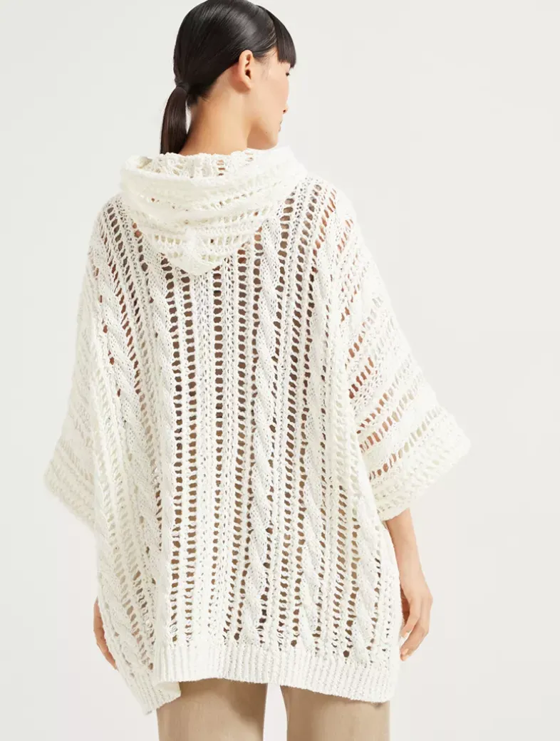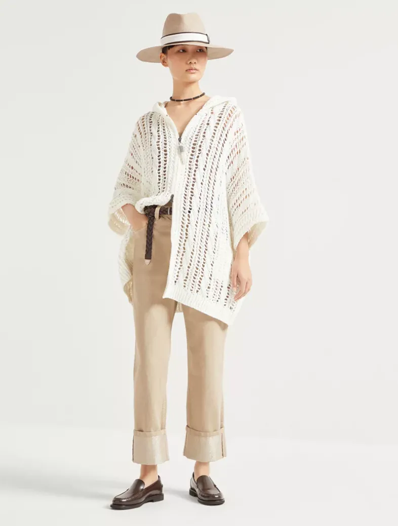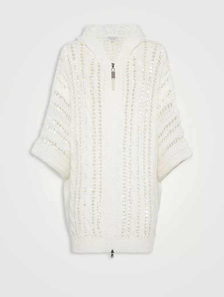 Jute and cotton cable & mesh hooded cardigan with shiny zipper pull