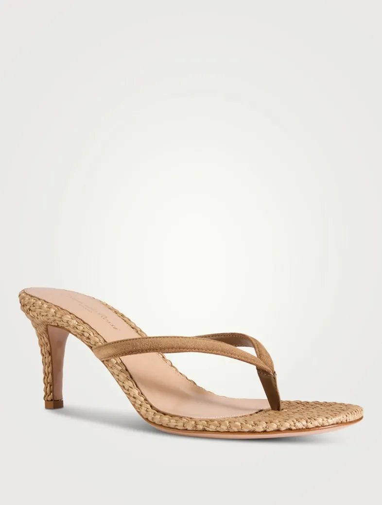 Crafted from suede and woven raffia, Calypso is a round-toe thong sandal with padded straps and a 70mm stiletto heel. Handmade in Italy.