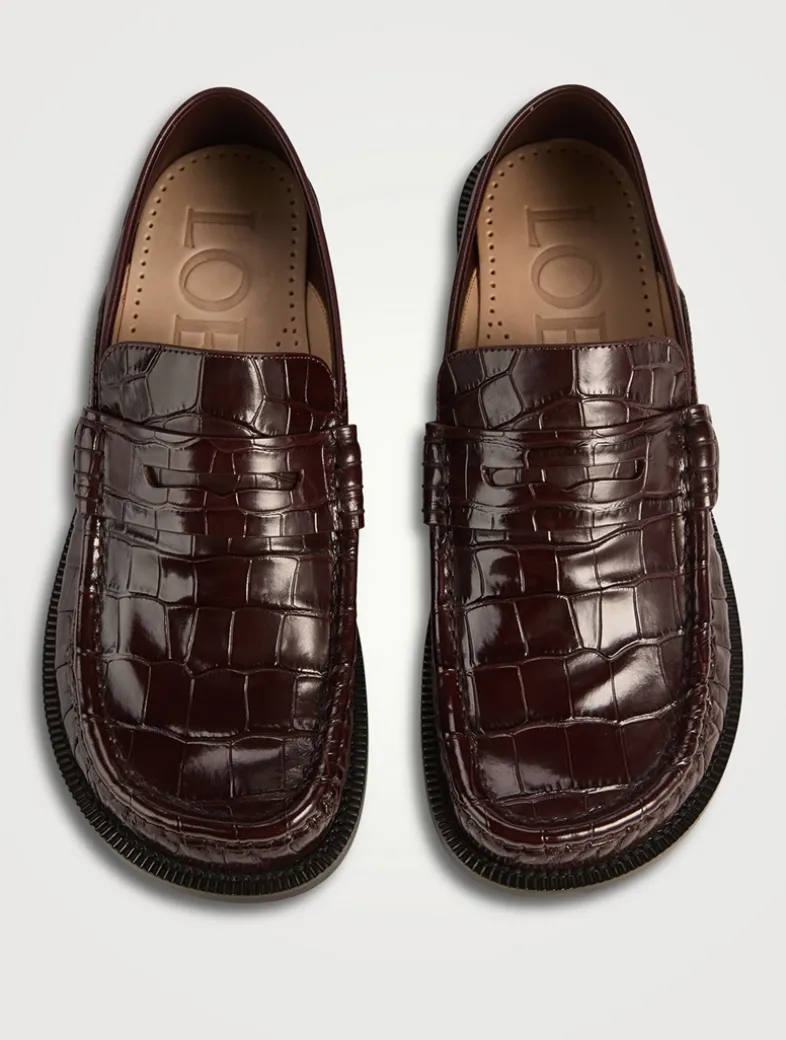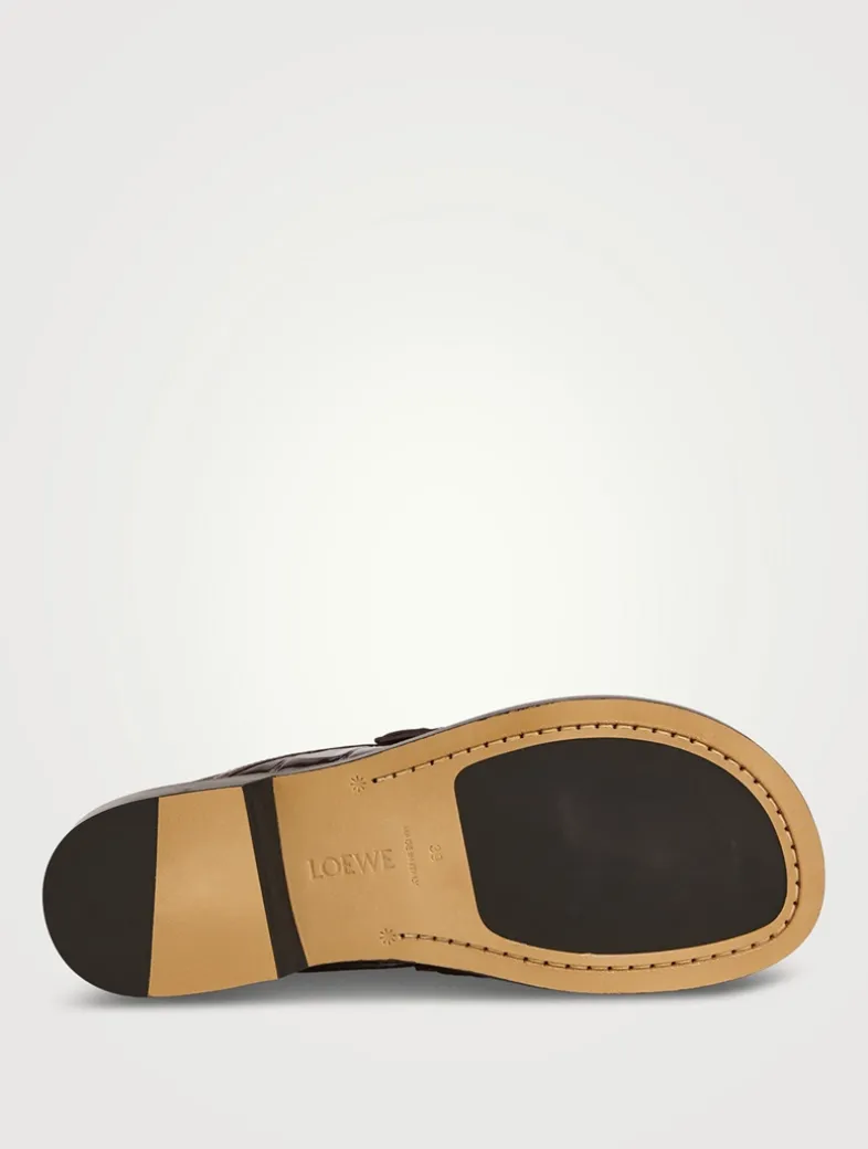 A modern take on a timeless style, these loafers are crafted in a mix of croco leather and smooth leather. Featuring the Loewe signature round toe shape, penny bar, and a collapsible heel. Finished with an extra padded leather insole for added comfort.