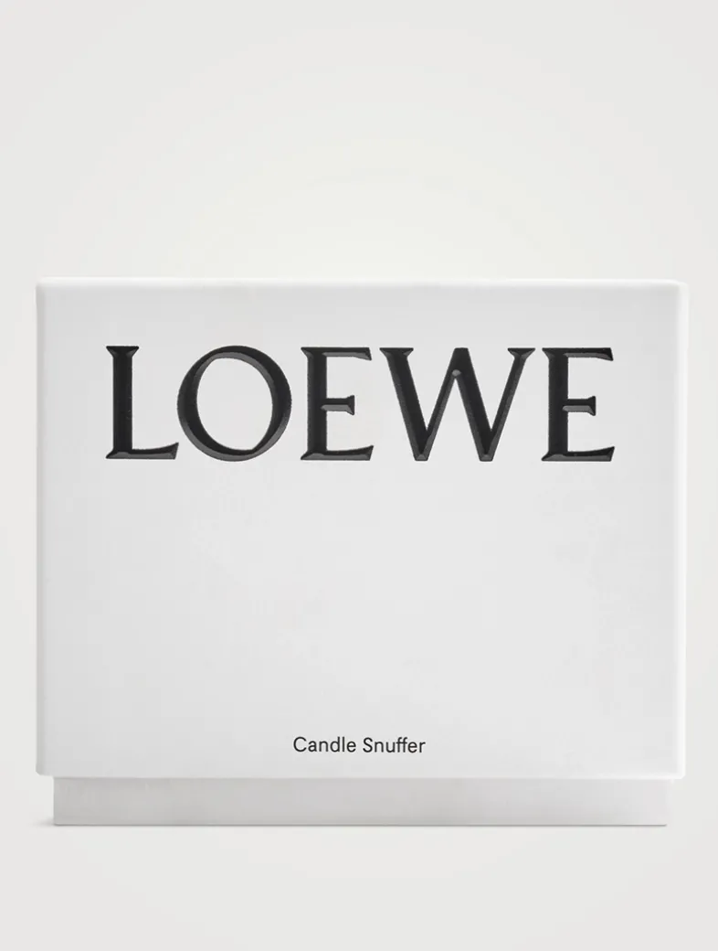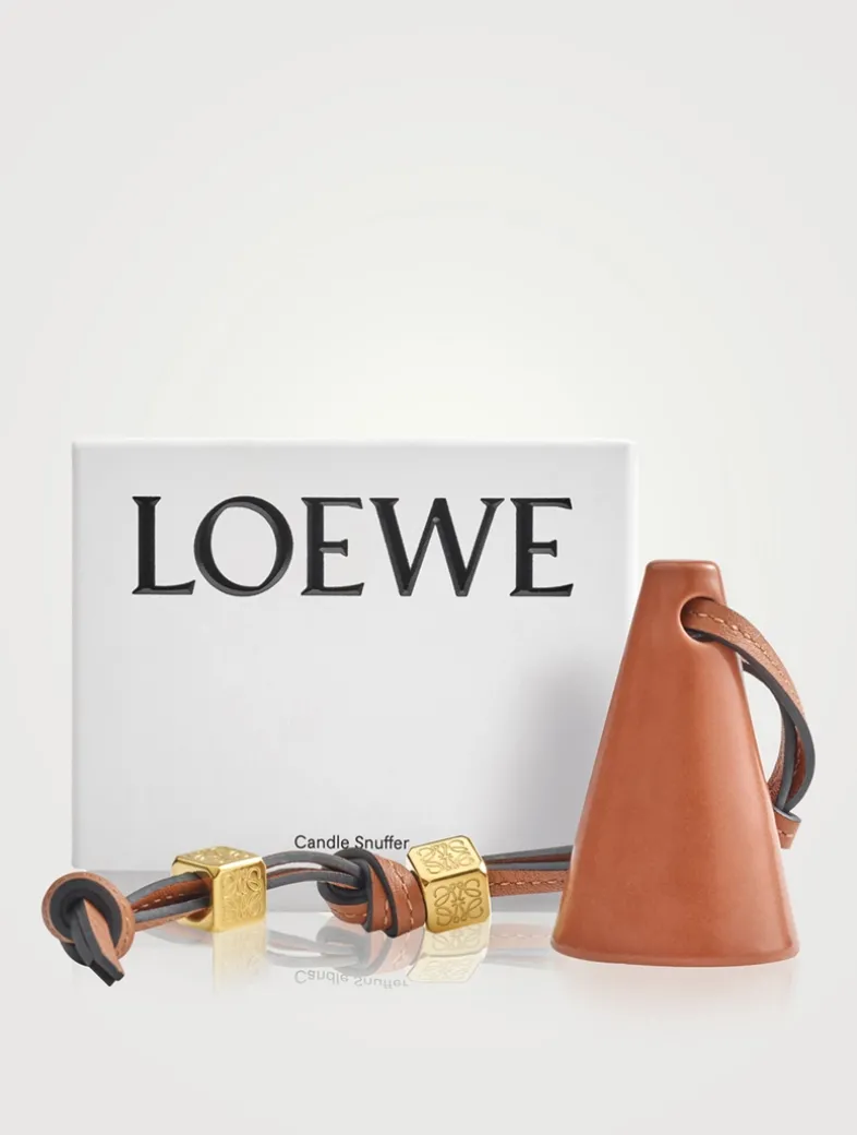 A cone-shaped Candle Snuffer in terracotta ceramic with integrated leather strap—the ideal accessory for extinguishing your LOEWE Home Scents Scented Candle safely and cleanly. Echoing the tactile finishes of LOEWE’s iconic bags, the strap features contrast stitching and two gold-plated, cube-shaped charms, stamped with the house’s Anagram symbol. Crafted in terracotta, the cone-shaped snuffer’s underside is glazed in black to resist soot stains. The integrated brown leather strap for ease of handling and signature Anagram charms plated in gold.
