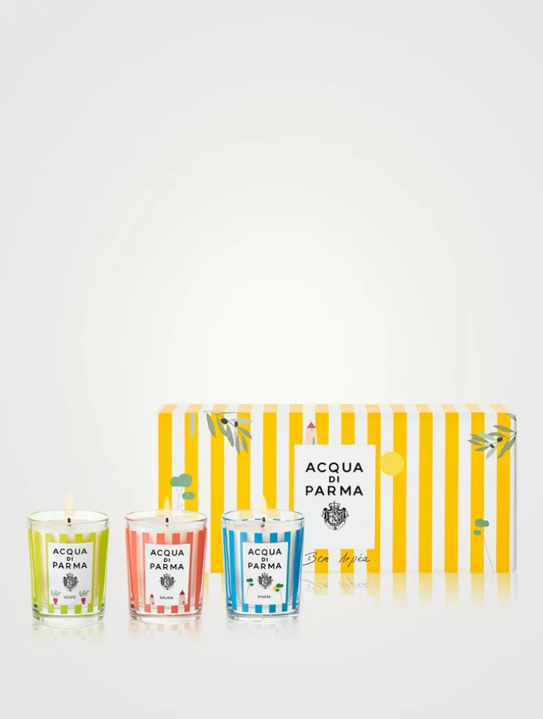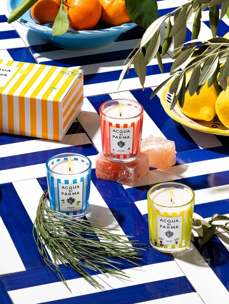 A seasonal exclusive Candle Trio with three summer candles presented in an orange and white stripe box designed by Ben Arpea to celebrate the beauty of Italian landscapes.