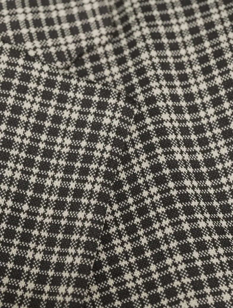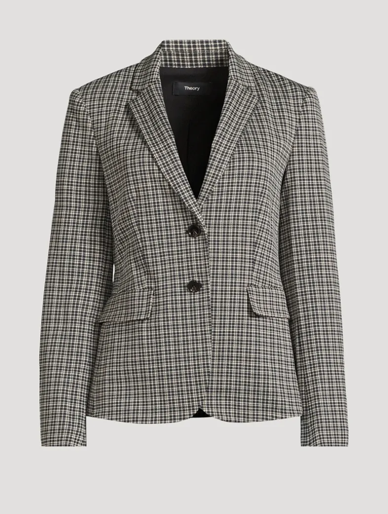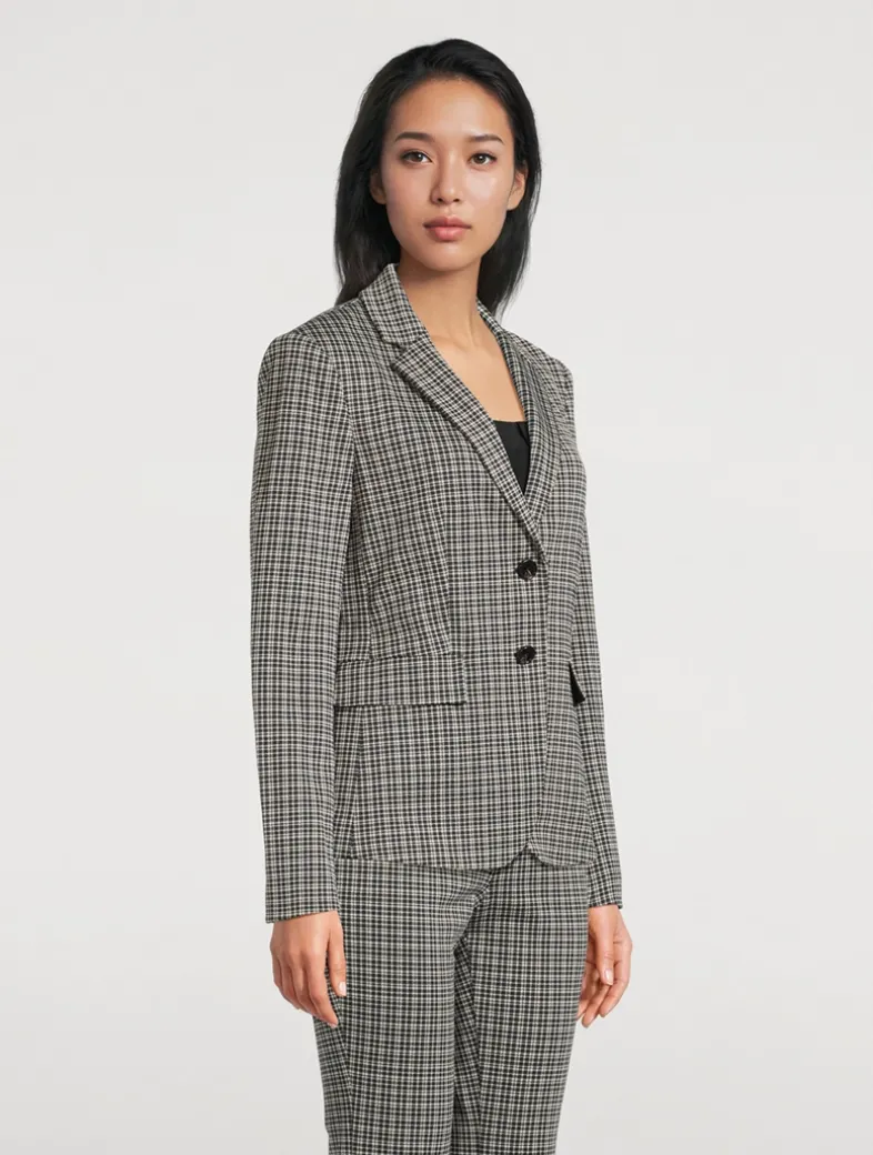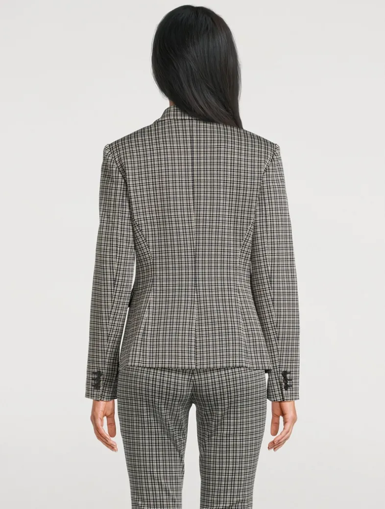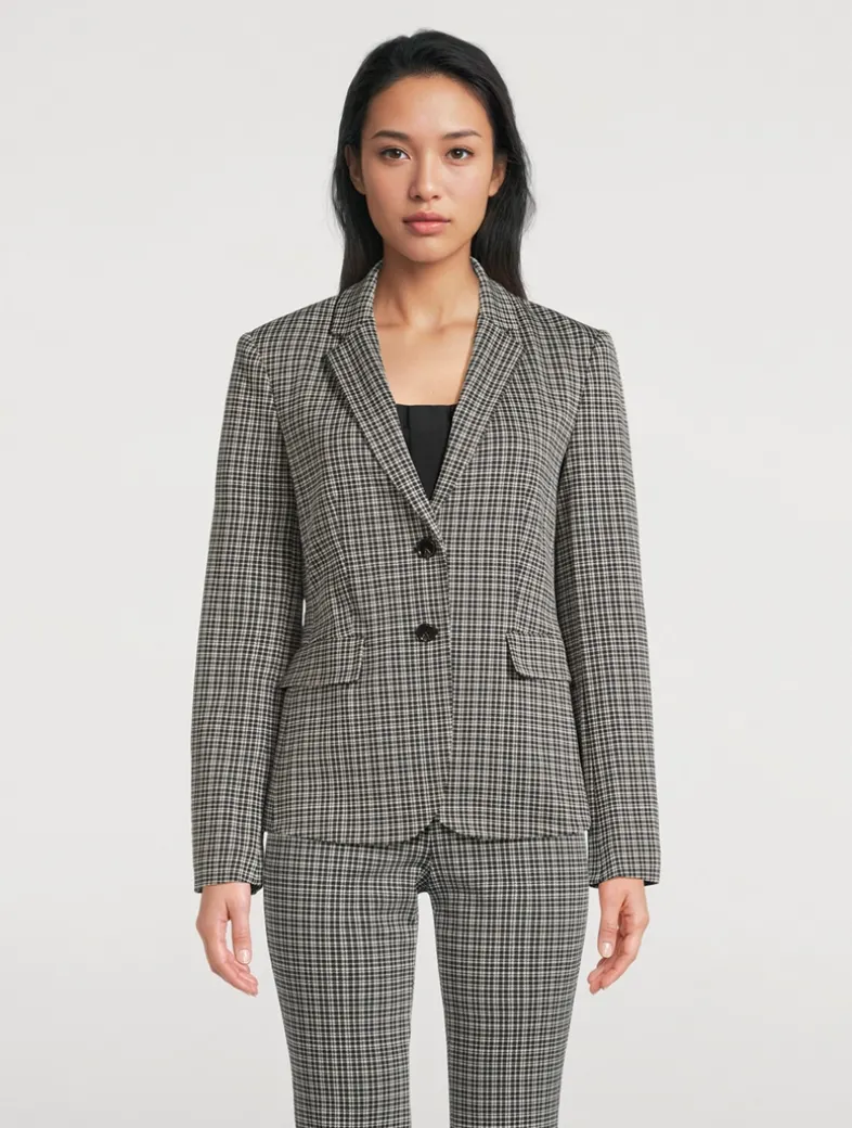 This two-button blazer jacket is designed with structured shoulders and a darted front for shape. Crafted in a stretch knit plaid, the blazer is finished with notch lapels, flap pockets and buttoned cuffs.