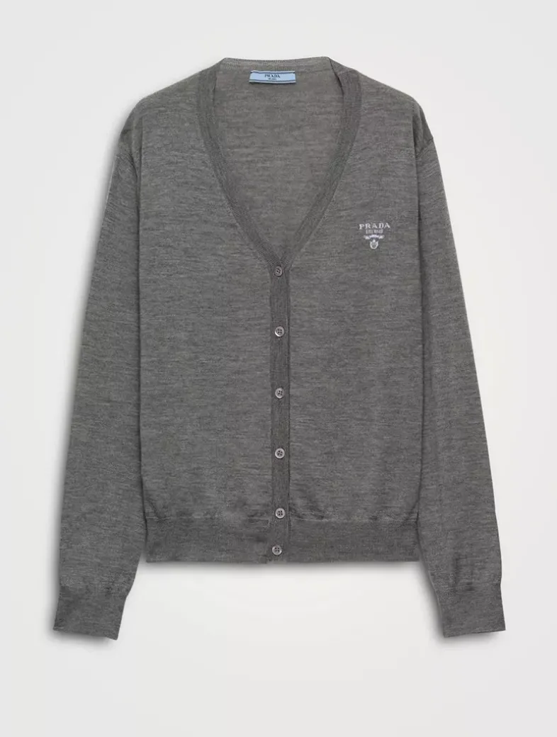 Long sleeves Plain knit Menswear fit Regular shoulder Ribbed knit cuffs and hem Intarsia logo Front button closure