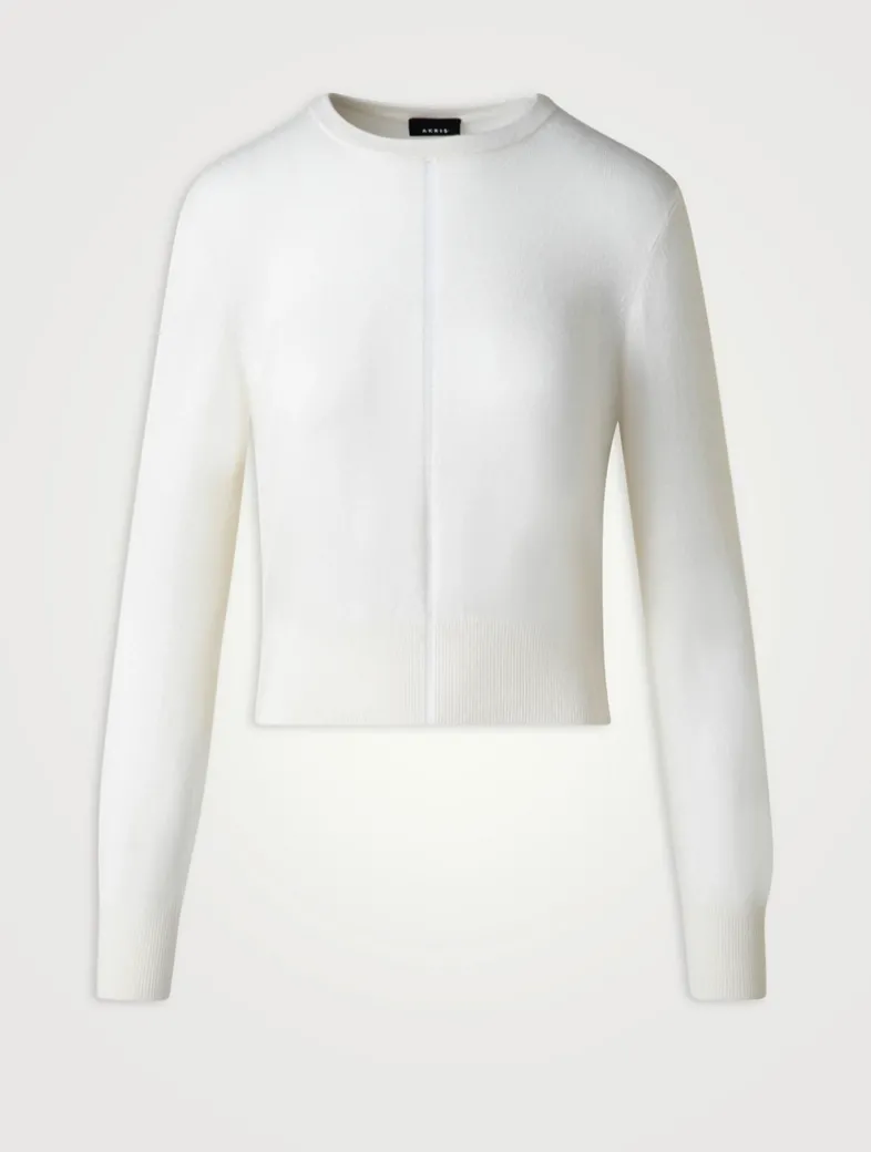 The classic sweater, elevated—this beautifully knit pullover features a fine sheer stripe down the centre front. Finished with a round neck and ribbed cuffs and hem.