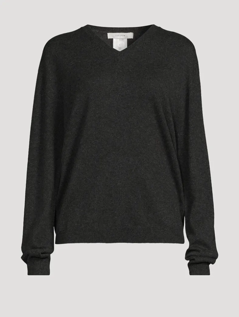 Knit in lightweight cashmere, this classic long-sleeve sweater has a V-neckline, seamless construction, and ribbed neckline, cuffs, and hem.