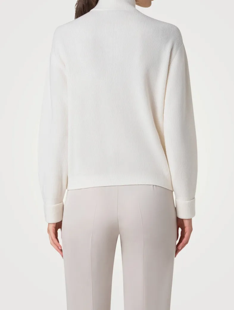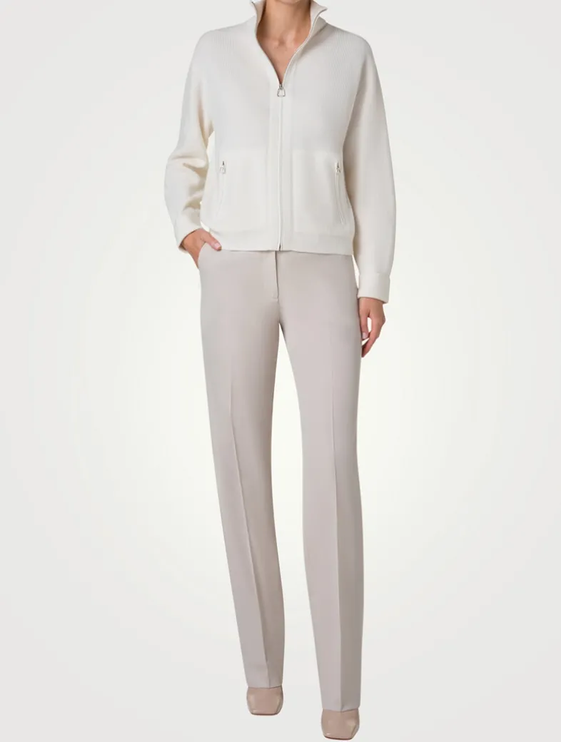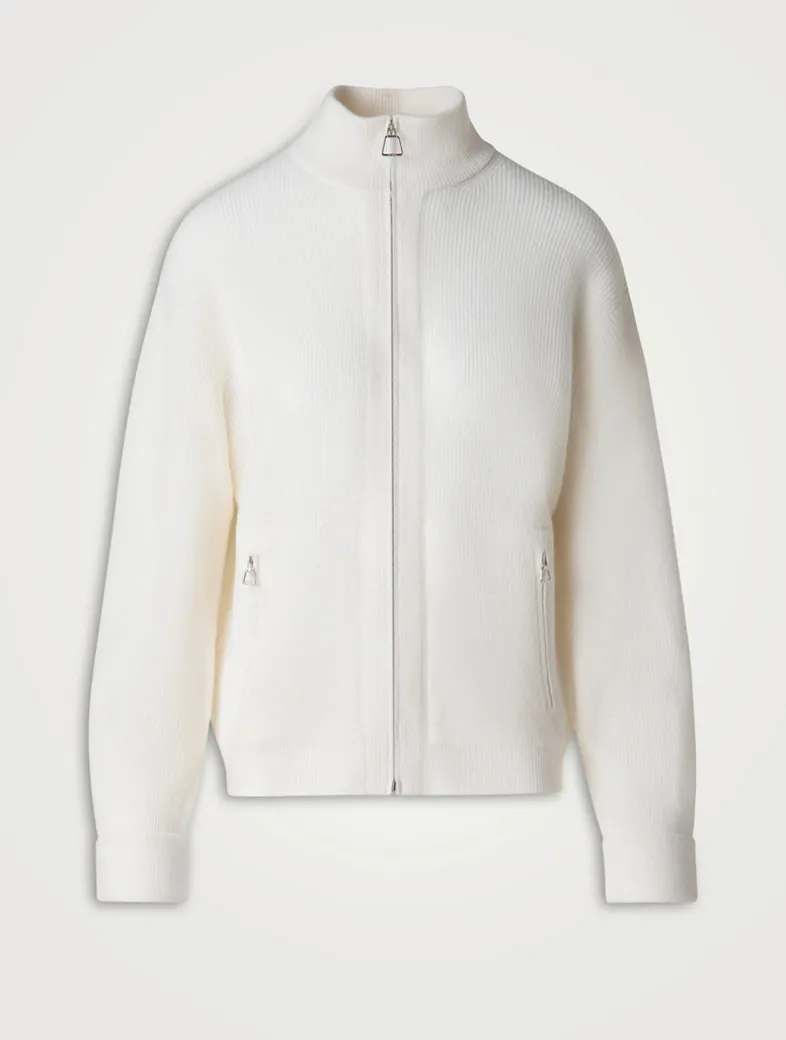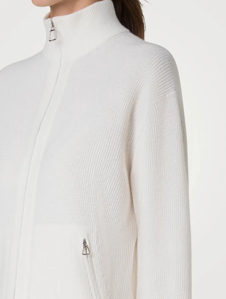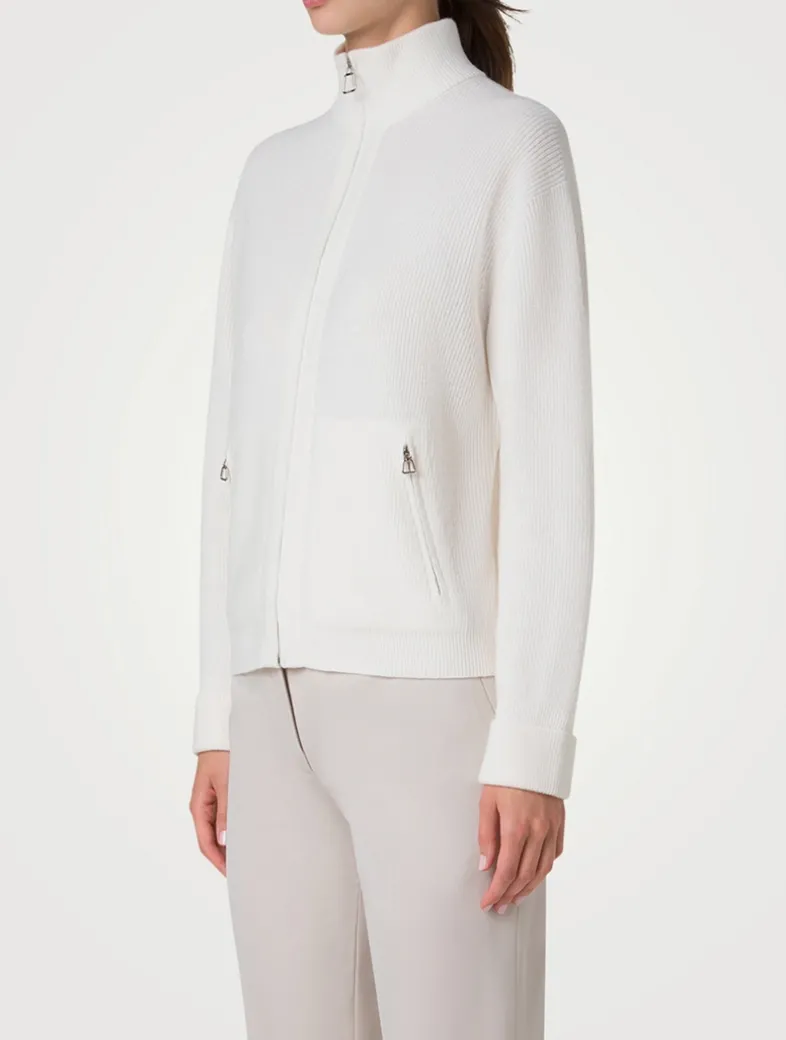 Crafted in luxurious 100% cashmere, this ribbed cardigan features a cozy stand collar, dropped shoulders, and zip pockets. Finished with a front zipper closure.