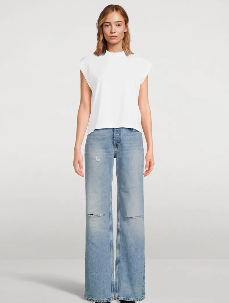 An elevated muscle tee crafted from a heavyweight cotton jersey featuring a rounded neckline and folded detailing at each sleeve. Finished with a small stitched ANINE BING monogram charm at the wearer’s bottom-left hem. The Caspen Tee is cut for a slim, boxy fit with a slightly cropped hem. Take your true size.