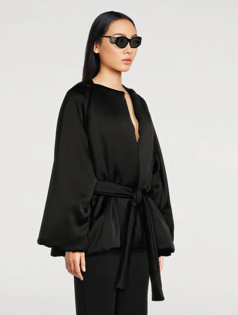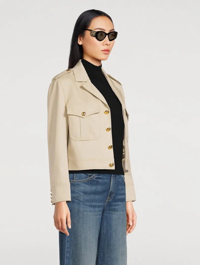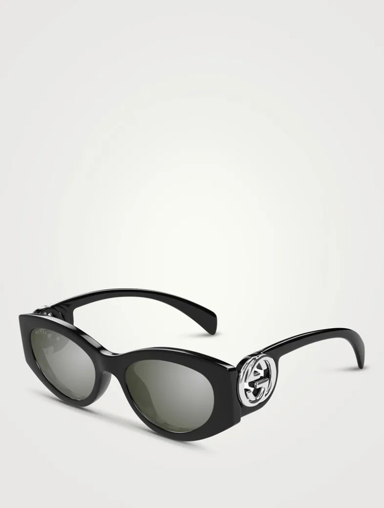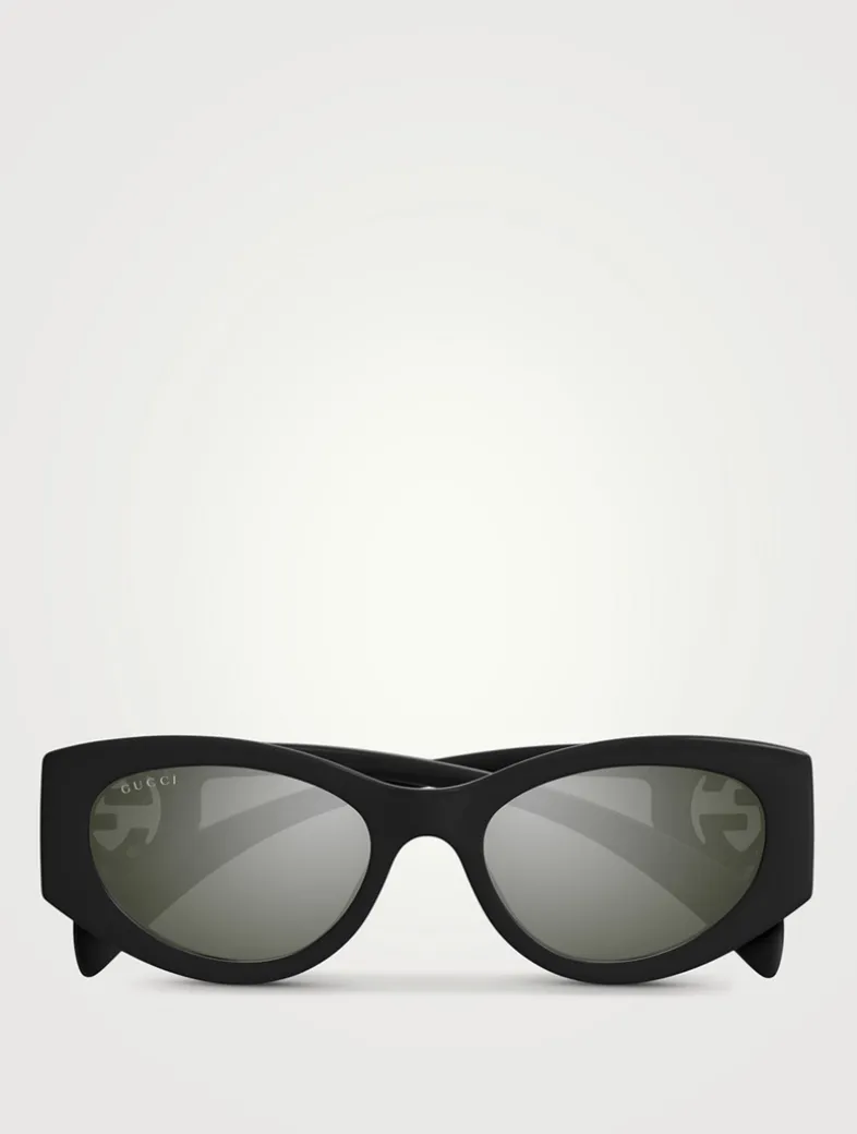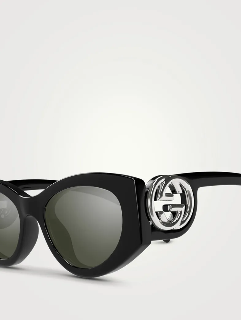 This Gucci eyewear collection combines the coveted silhouettes of bygone decades with a contemporary logo feel. These cat-eye injection frames are decorated with an Interlocking G cut-out detail on the temples.