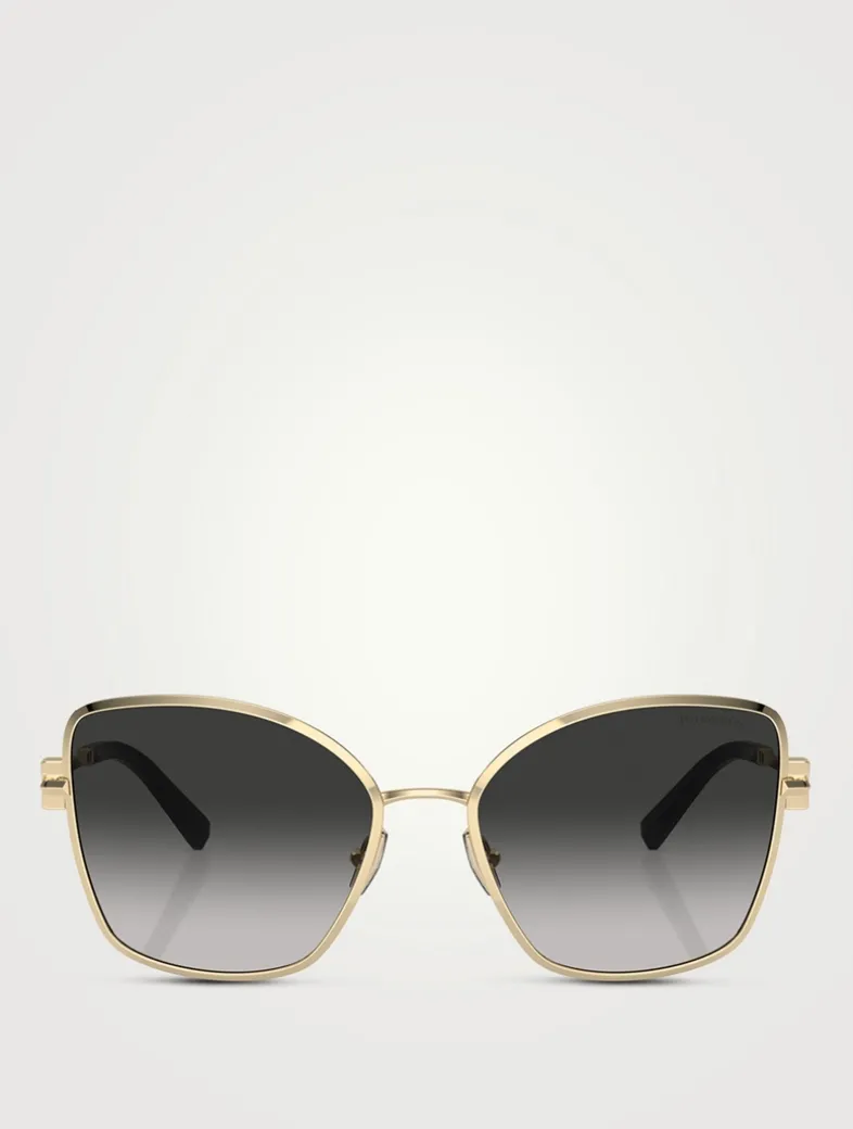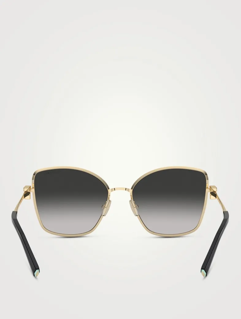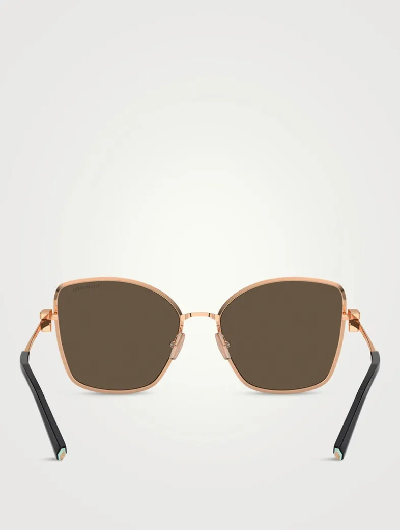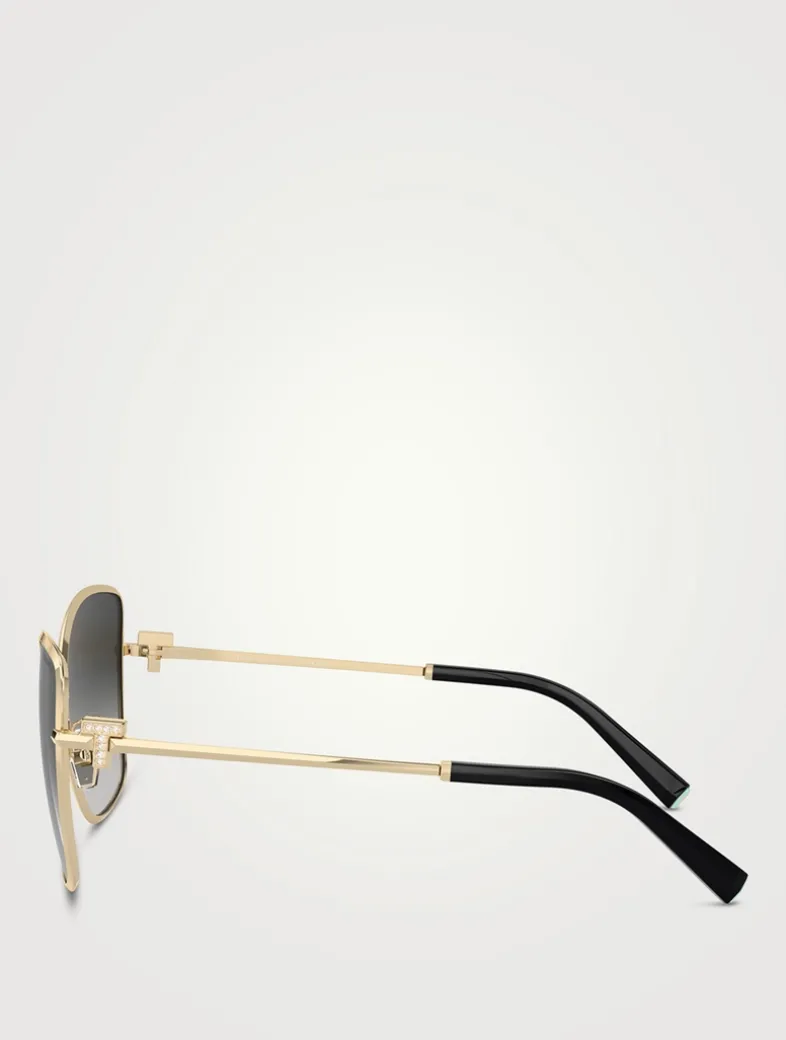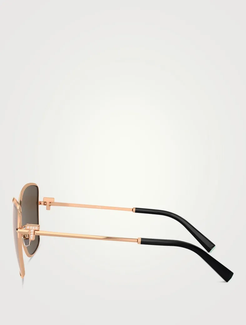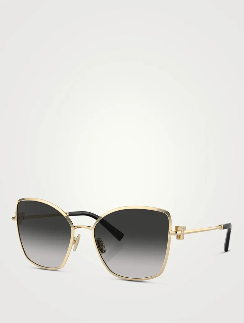 Introducing the Tiffany T Collection, making a triumphant return with the iconic Tiffany T featured at the temples. This cat-eye style showcases dazzling crystals adorning the Tiffany T.