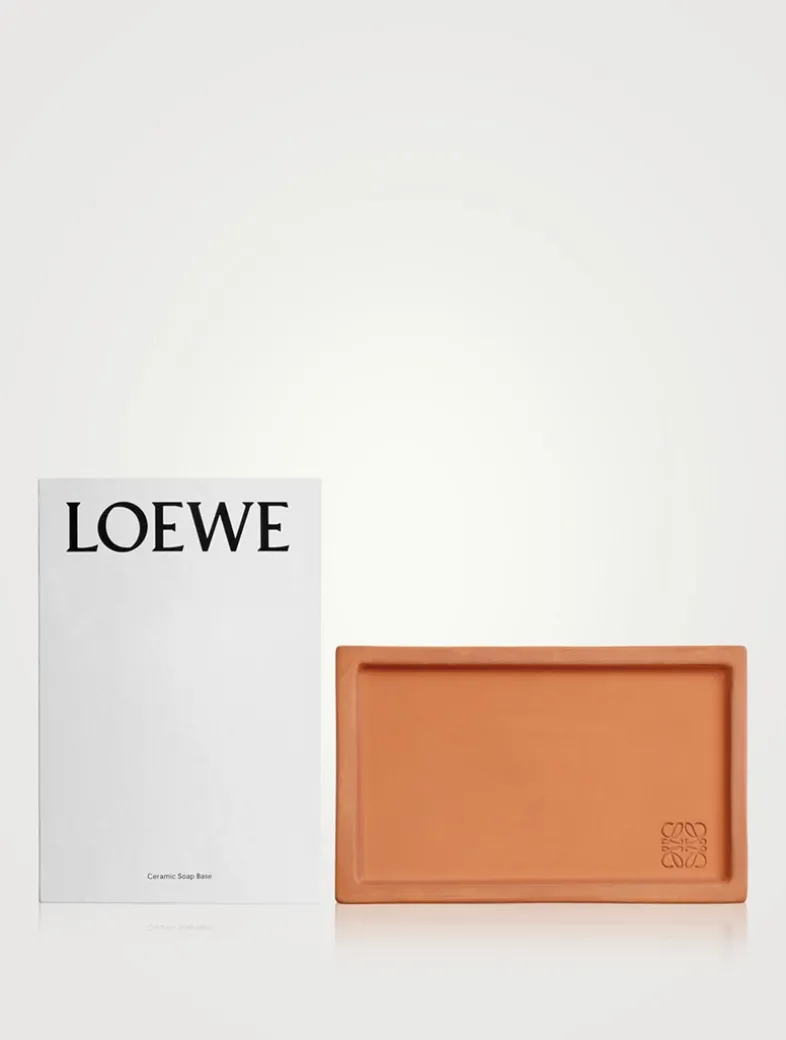 A rectangular Soap Base in terracotta ceramic—the perfect accessory designed to hold your LOEWE Home Scents Solid Soap. The Soap Base is ribbed to aid the drainage of water, echoing the appearance of our Scented Candle vessels and the traditional design of washboards. Crafted in terracotta, it is stamped with LOEWE’s Anagram. The top side is glazed, and the underside is textured for a stabilising, anti-slip surface.