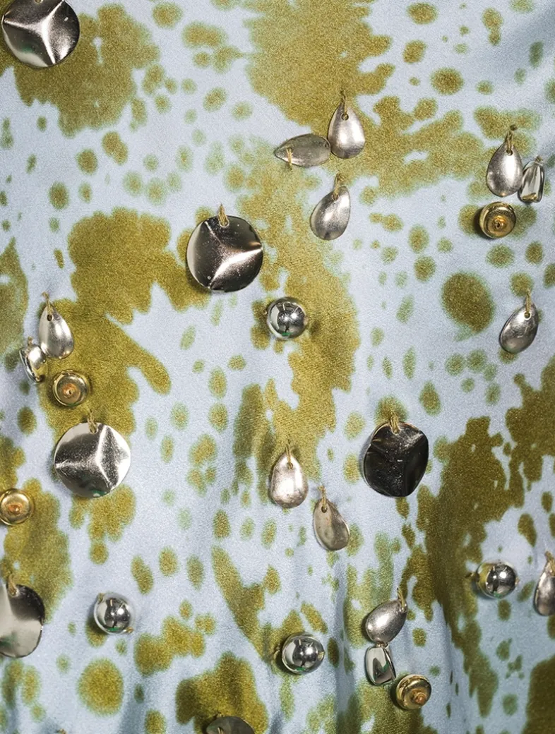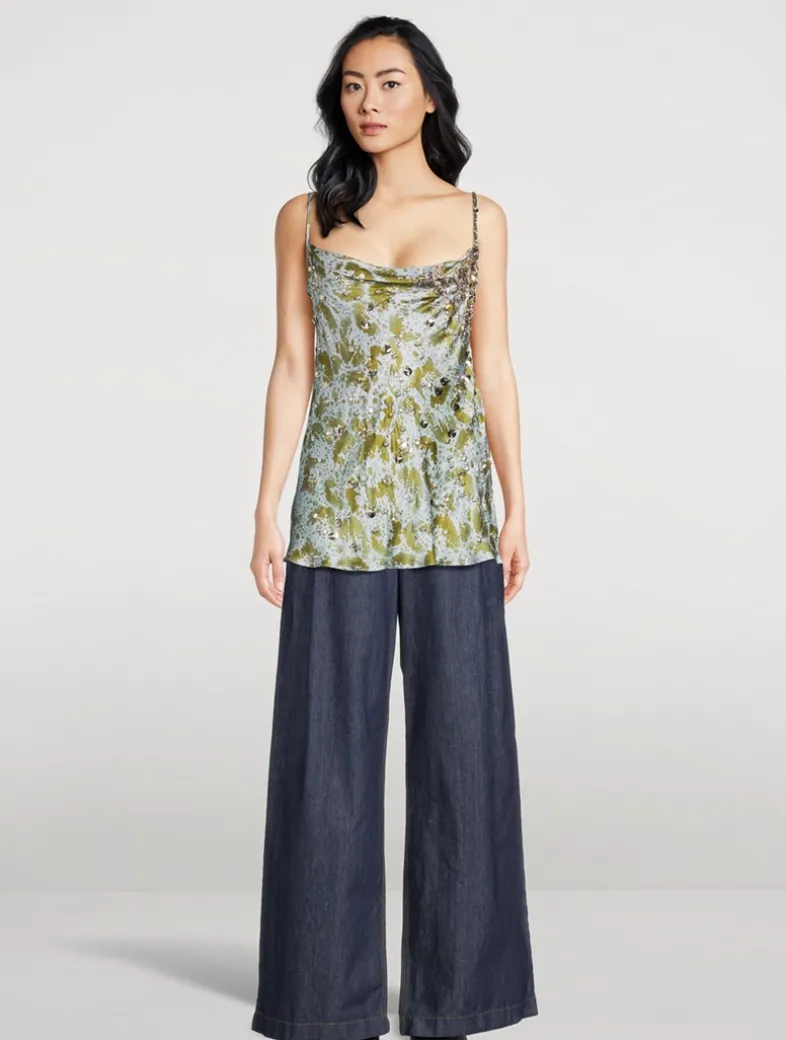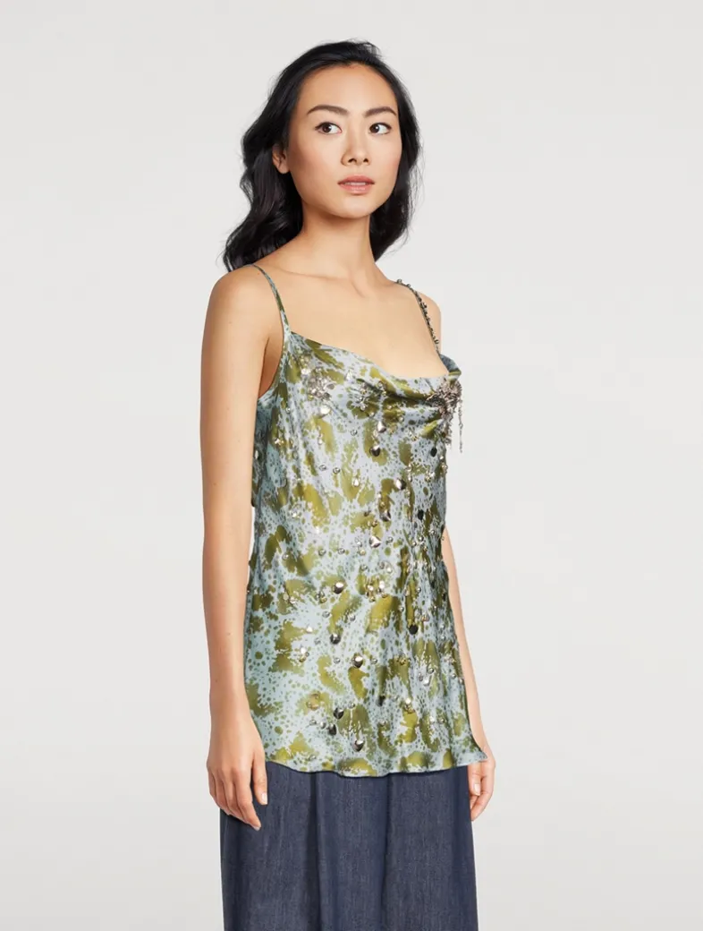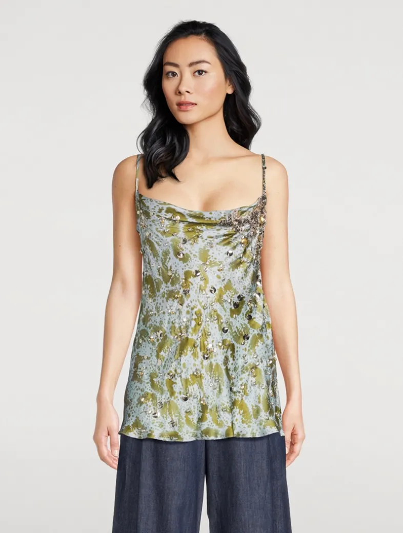 A bias-cut silhouette lends a slinky touch to this silk blouse. Framed by slim straps, it has a draped cowl neckline and a draped back. The camisole has an abstract print and delicate beaded embellishment allover.