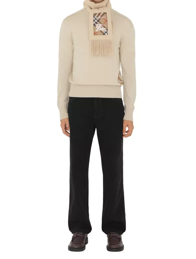 A cashmere scarf woven on traditional looms at a 200-year-old Scottish mill. The fabric is washed in local spring water and receives two further washes for an ultra-soft finish and raised nap. Reworking the label from our signature trench coats, the style features an appliquéd patch woven with the Burberry Check, logo and Equestrian Knight Design.