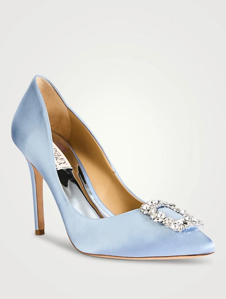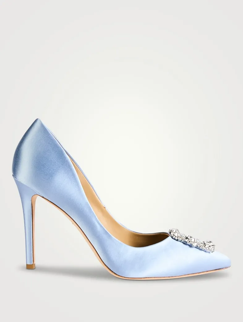 A dazzling crystal-embellished brooch highlights the toe of these pumps. Crafted from a glossy satin, they are set on a high heel.