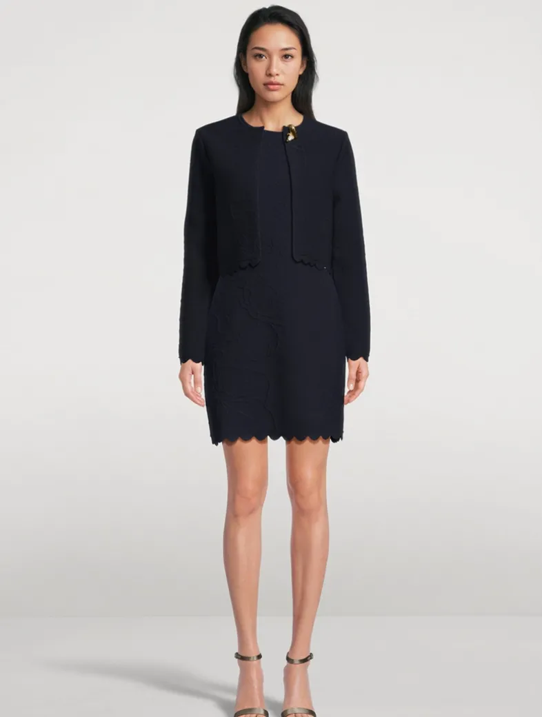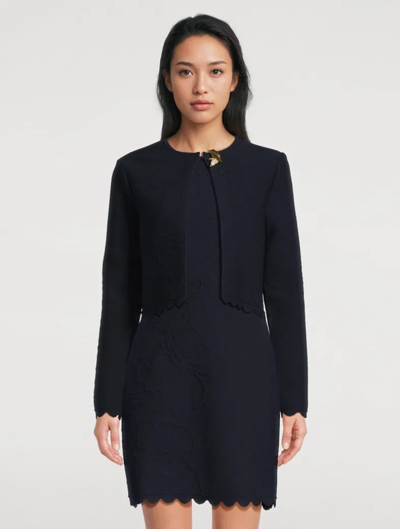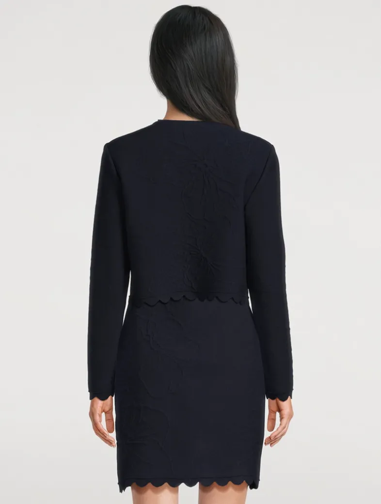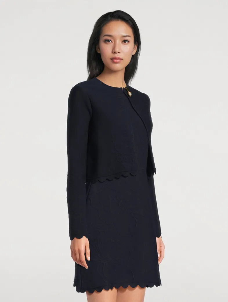 This long-sleeve cardi is knit from a cotton blend and cut to a slim silhouette with a scalloped hem that is cropped to the hip.