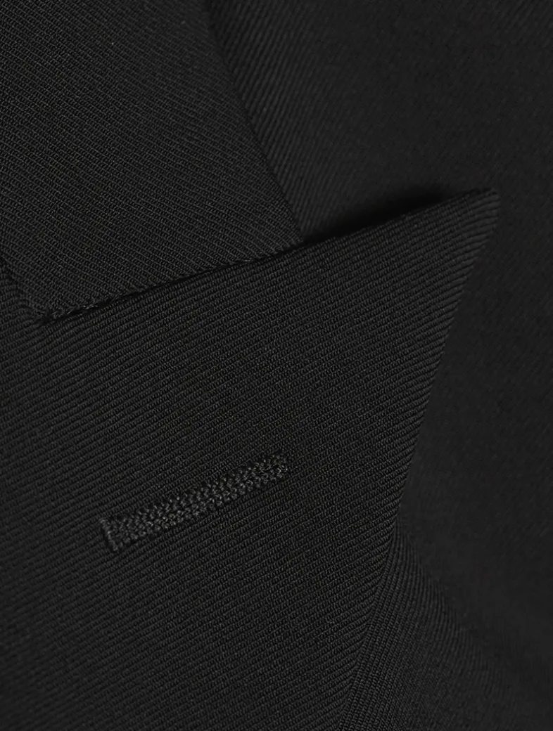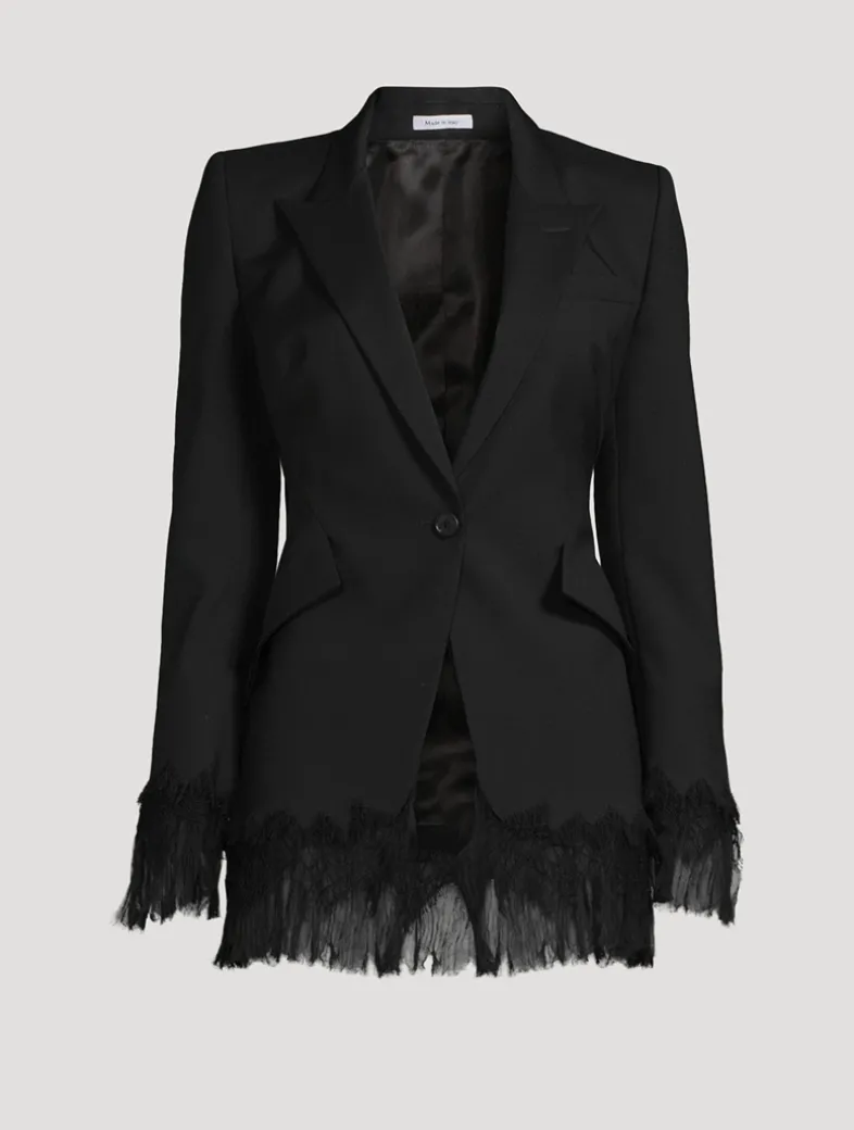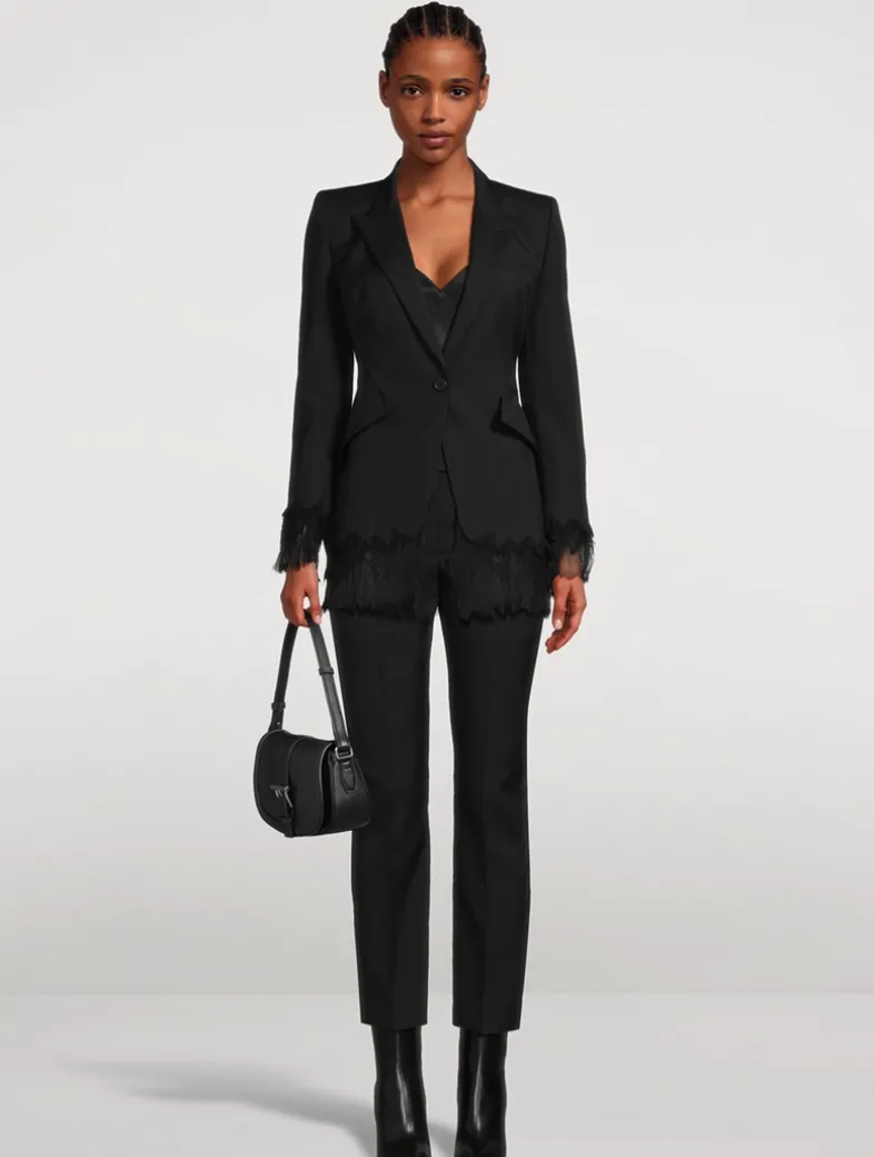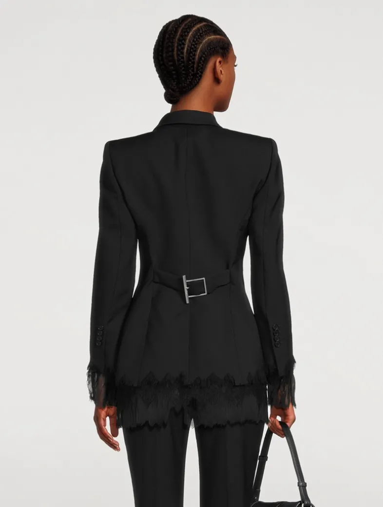 Crafted from wool, this classic tailored blazer is embellished with tonal chiffon trim around the cuffs and hem. It is cinched with an adjustable buckle at the back waist.