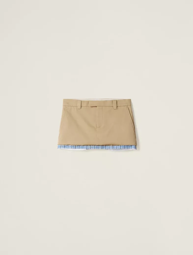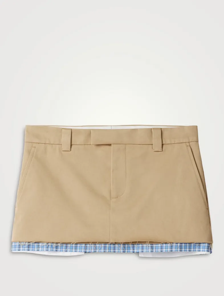 Mini silhouette Lined garment Center zipper with hook Back welt pockets Raw-cut hem with pocket lining peeking out underneath the hem Lettering logo