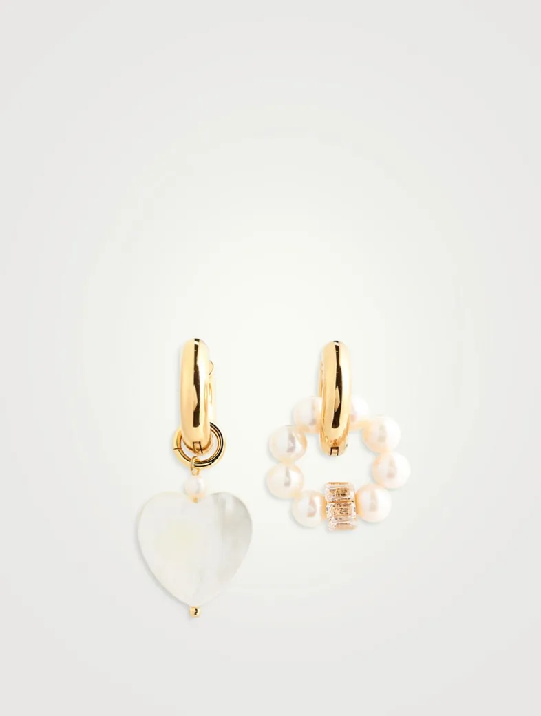 Montreal content creator Julie Etienne, aka Mademoiselle Jules’ concept jewellery line allows wearers to build a variety of pieces by adding charms. Finished with 24K gold plating, these chunky hoop earrings are adorned with one round pearl charm with a sparkling ring, and one heart-shaped pearl charm. Both charms are removable.