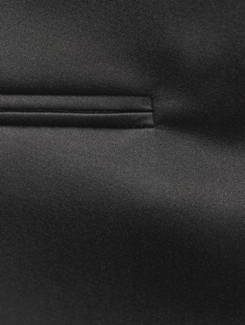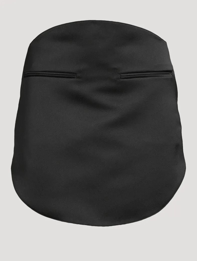 Designed with a circular front, this glossy satin mini skirt has two front welt pockets and a back zip closure.