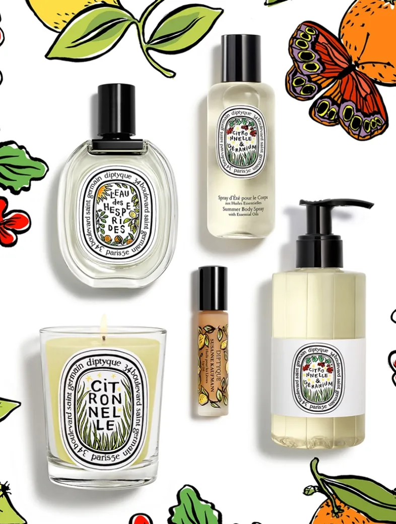 Lemongrass, known to repel mosquitoes with its lively and aromatic notes, invites you to enjoy a long summer evening. Verbena, neroli, and orange blossom combine with lemongrass to reveal its floral and lemony facets. On the label, artfully illustrated by Marie-Victoire de Bascher, an aromatic garden comes to life.