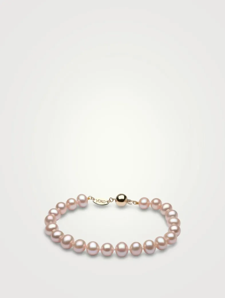 This elegant bracelet is designed with natural colour pink freshwater pearls, and finished with an 18kt yellow gold ball clasp.