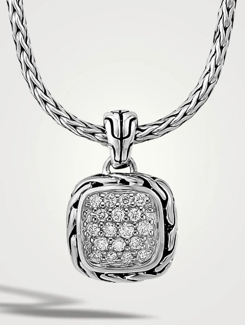 John Hardy’s iconic Classic Chain Collection is a symbol of eternal human connection and community bond. This piece is features a square pendant encrusted with diamonds.