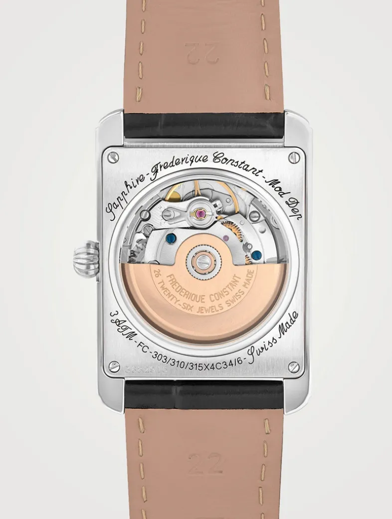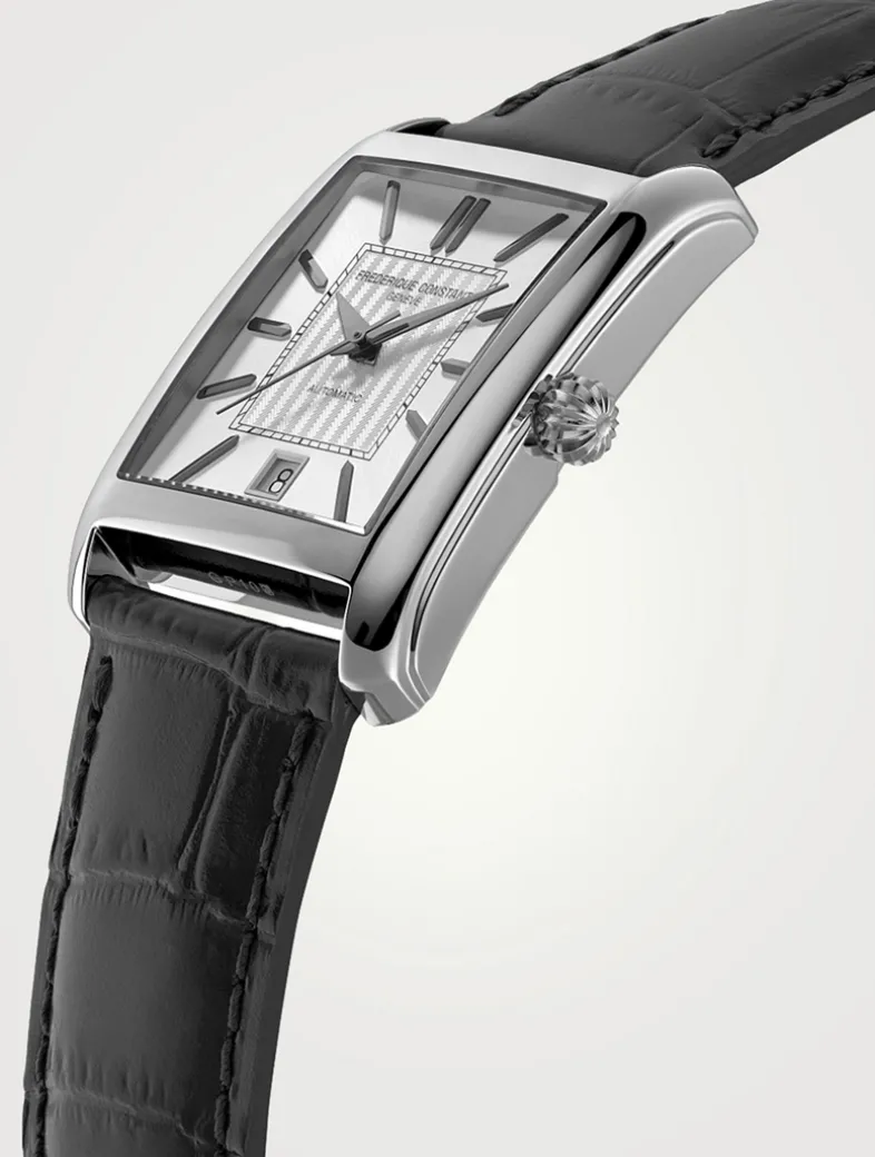 Built with a stainless steel rectangle case, the Classics Carrée features a silver dial with guilloché decoration, applied black markers and sword shaped hands. Powered by the FC-303 calibre, and complemented by a leather strap with alligator embossing.