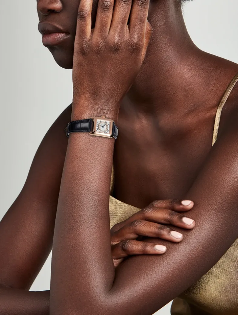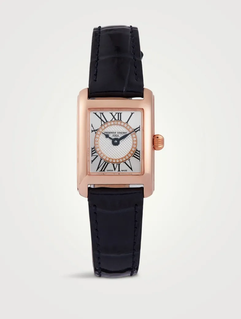 The seamless lines and elegant polished case of this Fréderique Constant watch reveal a classical white dial showcasing intricate “clous de Paris” decoration and traditional Roman numeral indexes. The smooth polished case perfectly blends with the design.